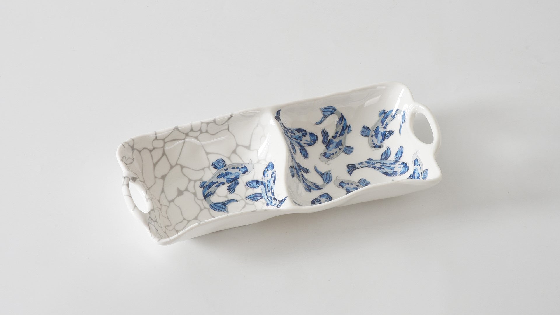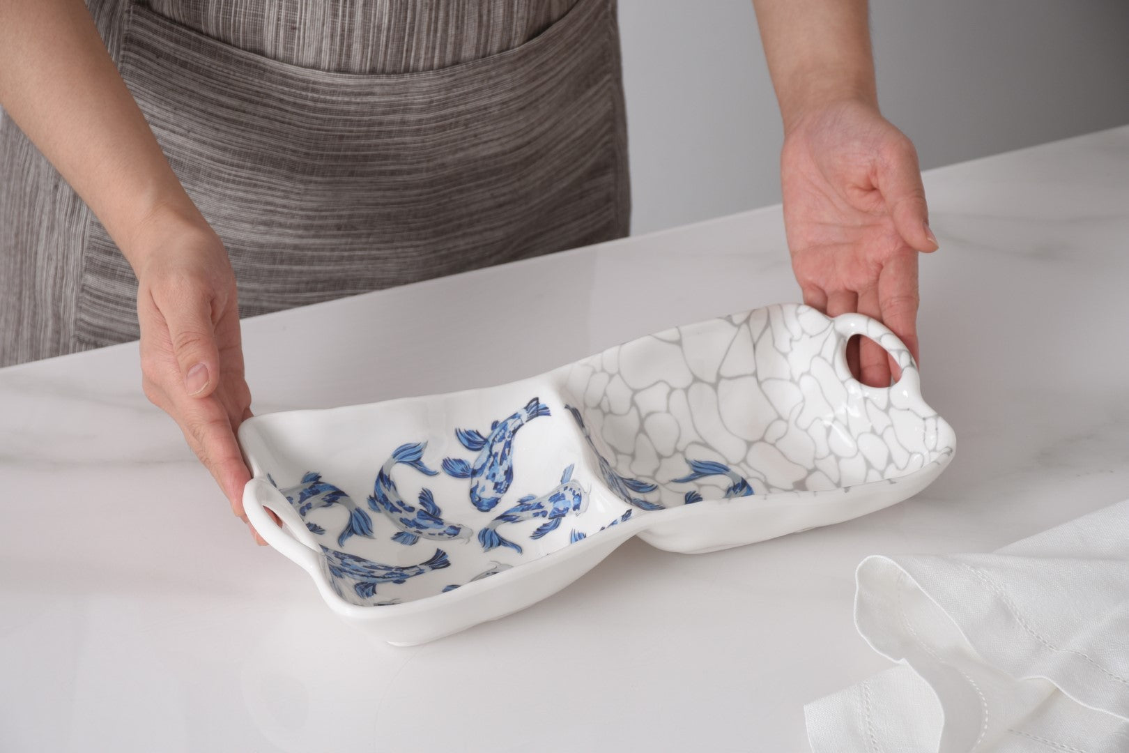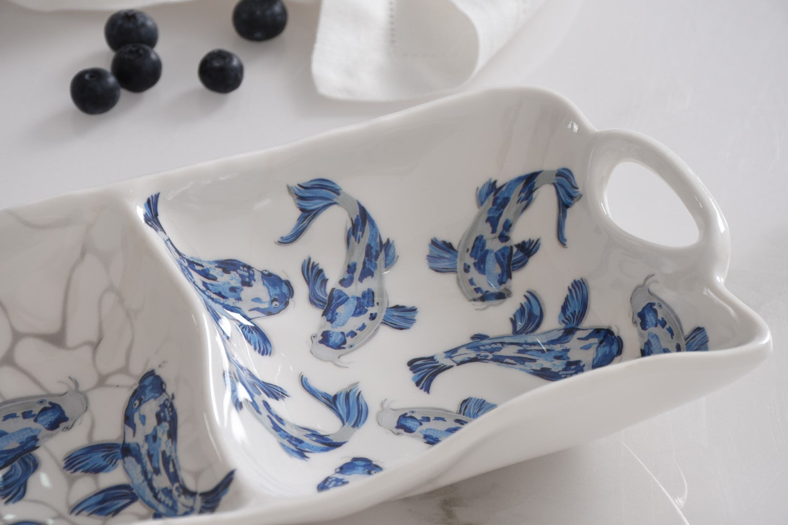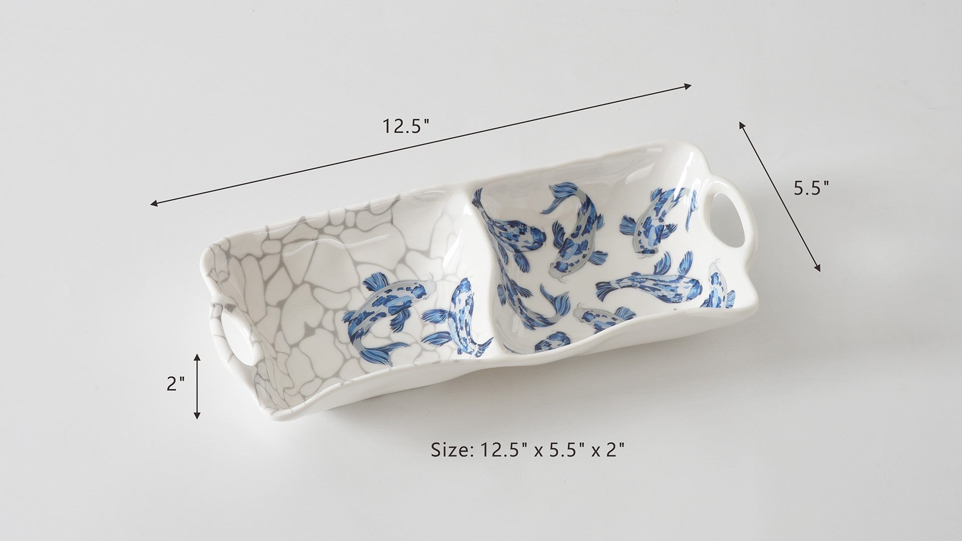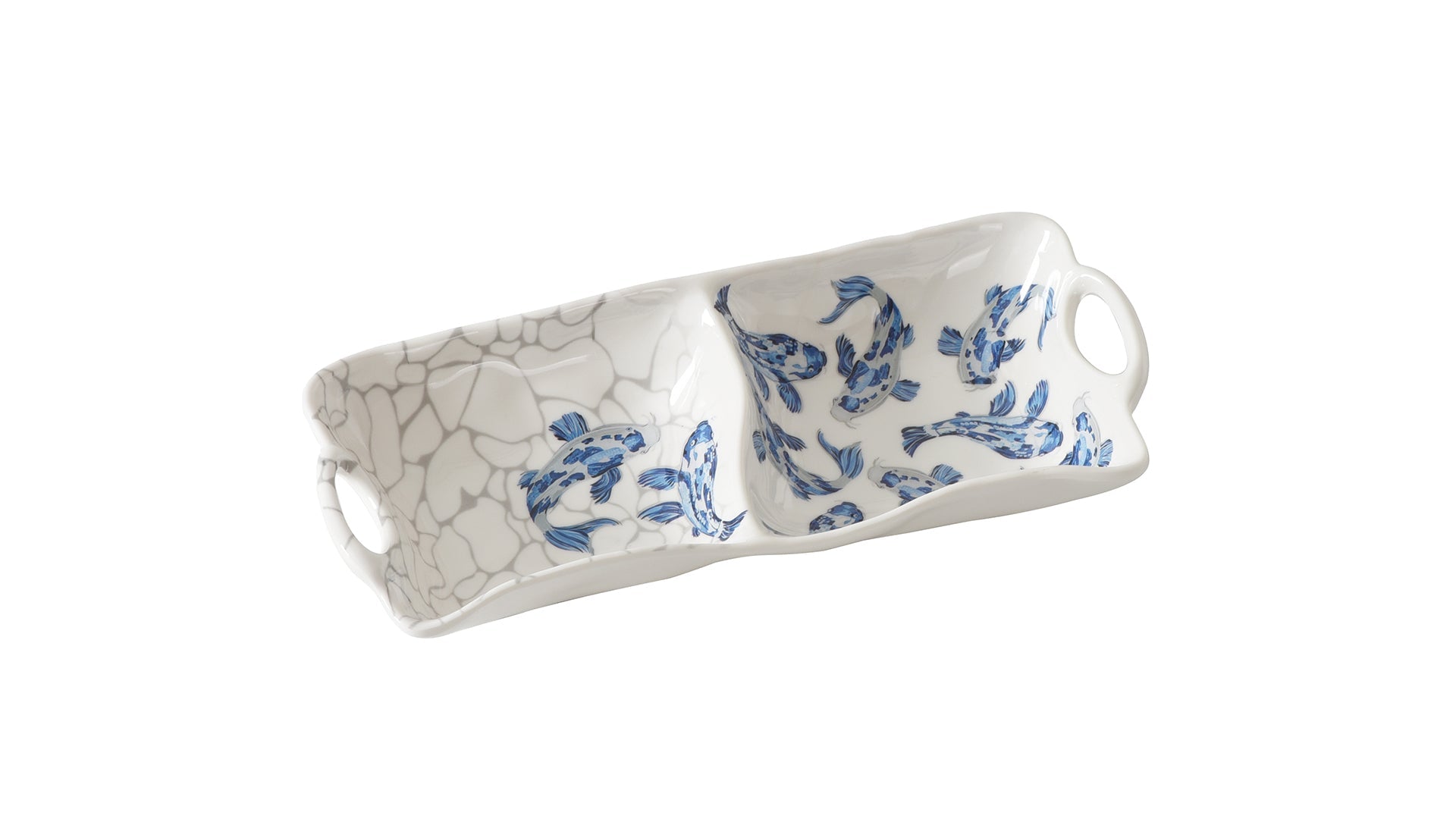 2 Section Server in our Koi Collection. Great for serving your favorite pairs! Think chips and dip, hummus and veggies or apples and peanut butter. The striking imagery of the koi combined with rich blue hues invoke a sense of harmony and serenity on this durable melamine piece. Great for your indoor and outdoor activities. Food safe, freezer safe, dishwasher safe. Easy Care.