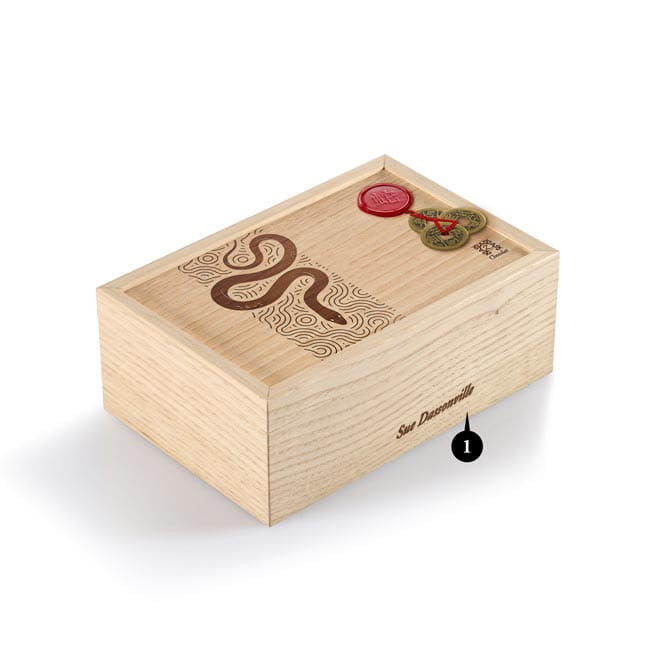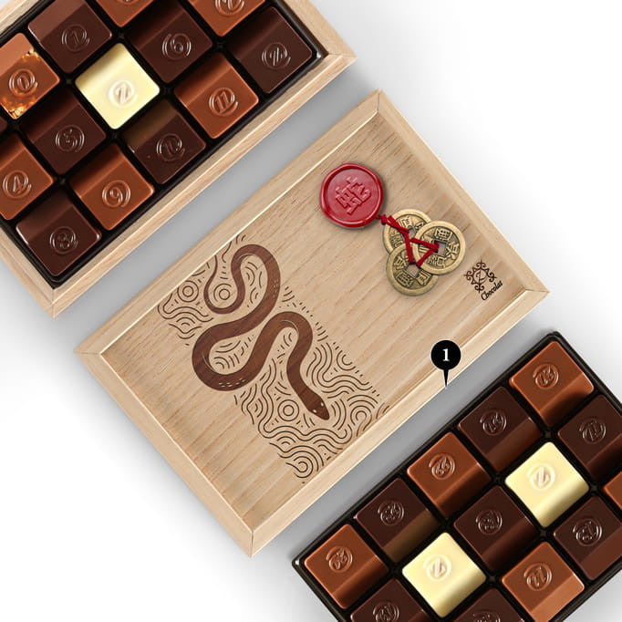 Celebrate the arrival of the Chinese New Year of the Snake, spanning from January 29th, 2025 to February 16th, 2026, with a luxurious box of hand-crafted confections. This exclusive chestnut wooden box, featuring the auspicious Snake symbol, holds 30 exquisite French chocolates meticulously crafted by World Champion Chocolatier Pascal Caffet. Savor the superb flavors of our complete Numbered Collection, with each piece showcasing unparalleled chocolate mastery. The box is adorned with "Year of the Snake" in traditional Chinese calligraphy and a handmade red wax seal, symbolizing strength, good fortune, and health. Accompanied by three fortune coins bearing the names of revered Chinese emperors, this gift is a distinguished gesture, bestowing wishes of health, prosperity, and joy.