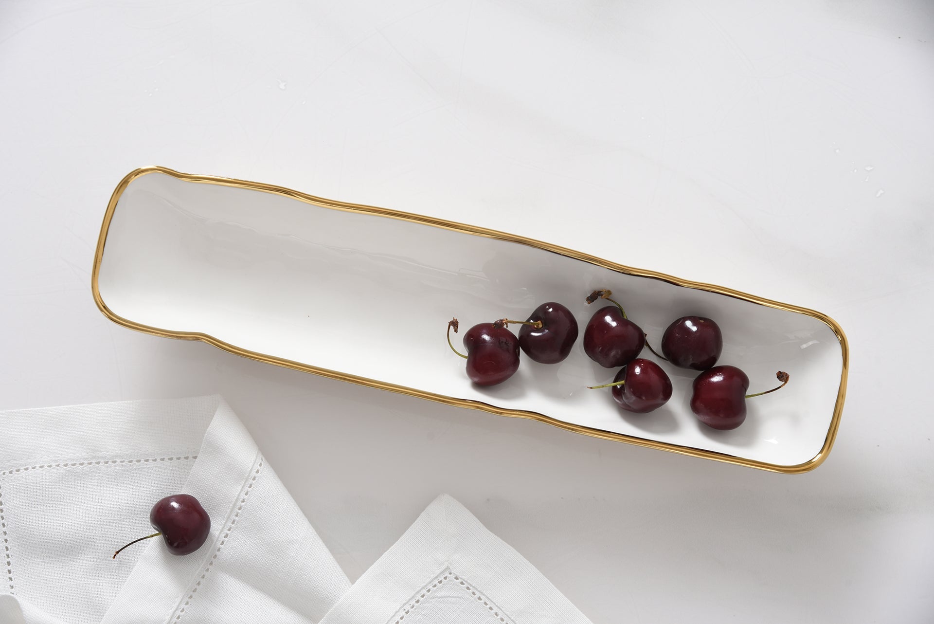 Cracker Tray in Sensu. Perfect for crackers, small cookies and bite-sized treats. Beautifully crafted in a stunning white porcelain with gold detail. Inspired by the beauty and unique shape of the Japanese folding fan called Sensu. Food safe, tarnish-free, dishwasher safe, oven safe to 500°F. Easy Care.