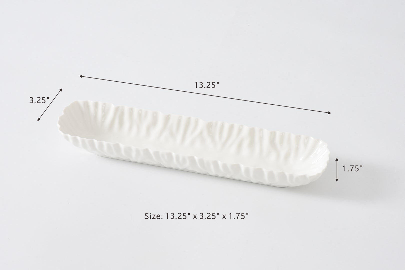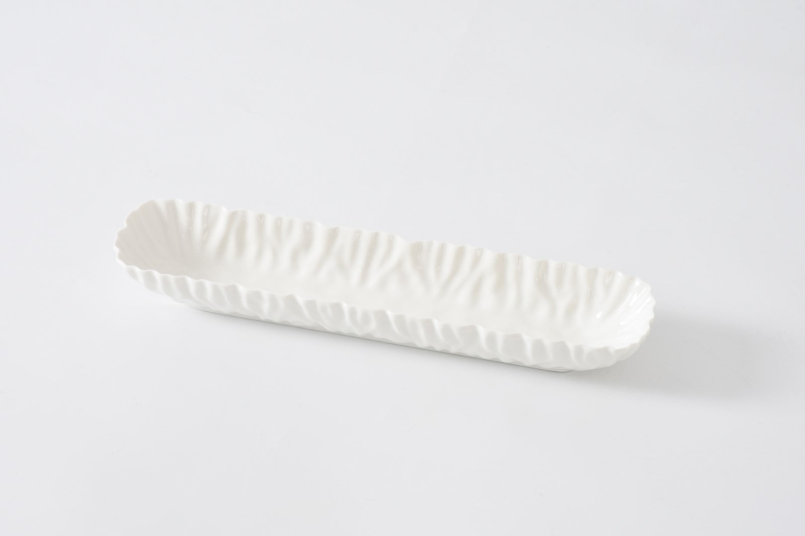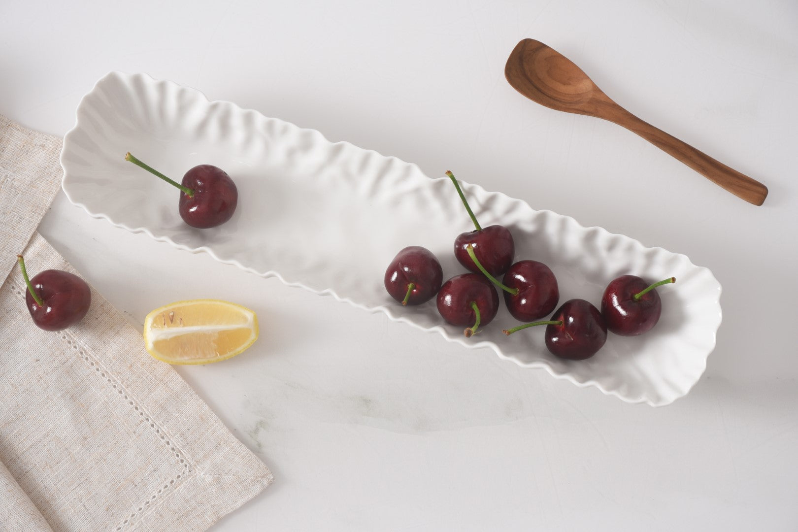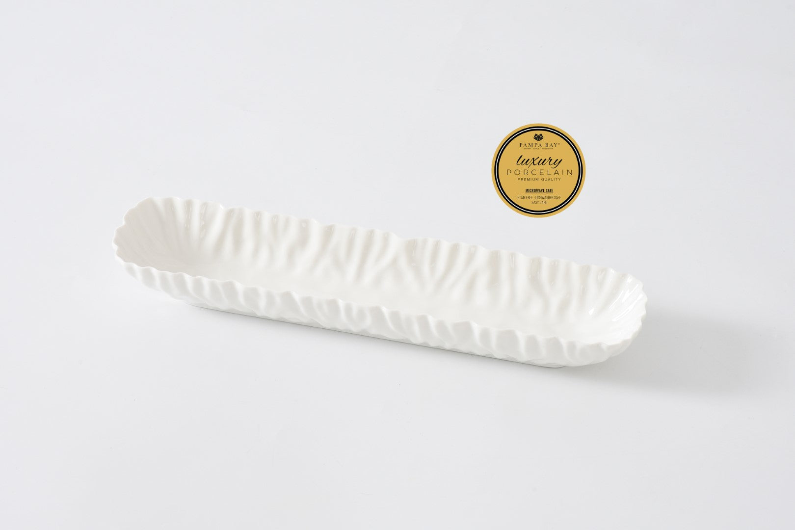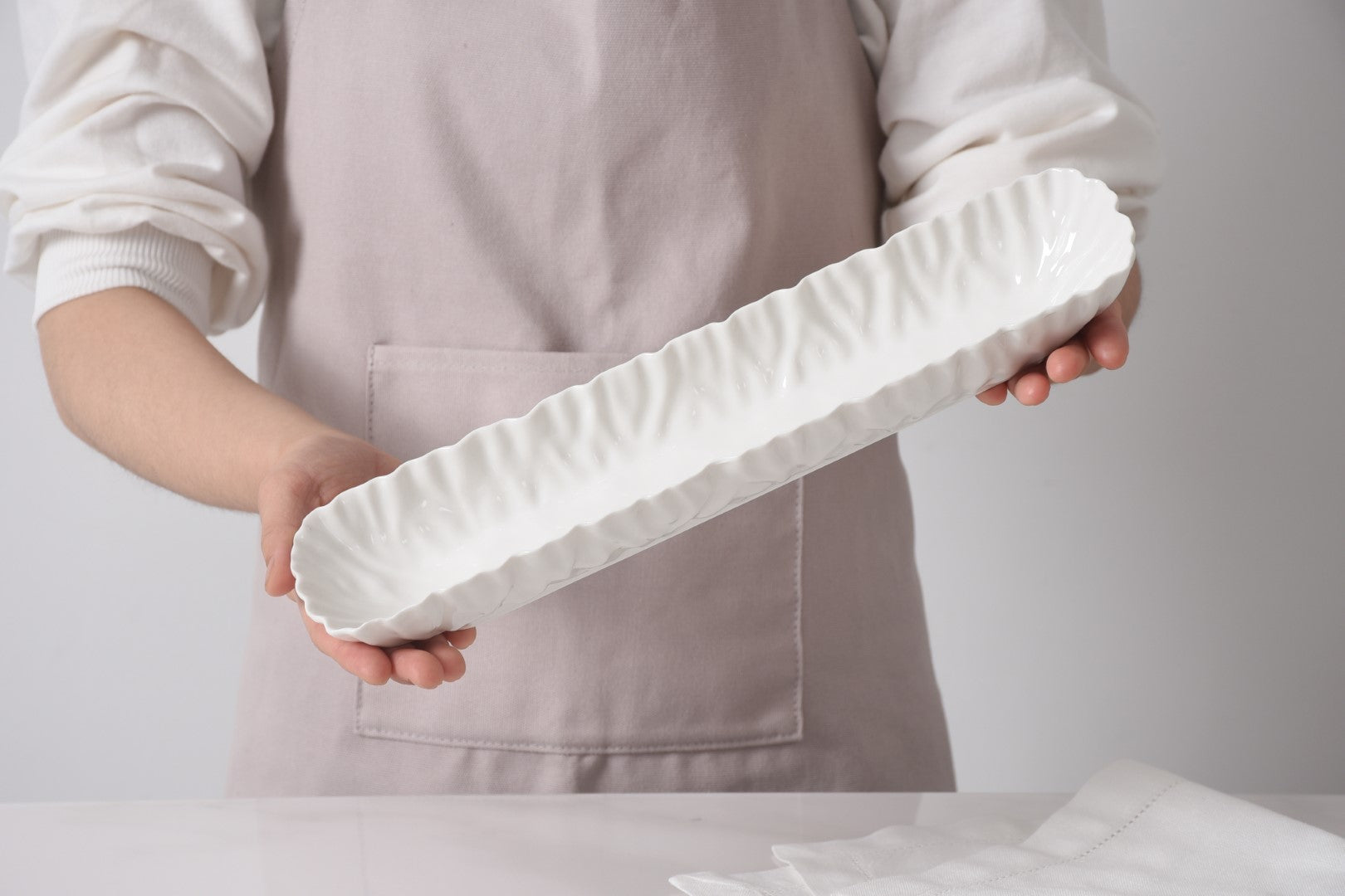 Cracker Tray in Mascali Bianca. Perfect for crackers, small cookies and bite-sized treats. Versatile high-fired porcelain pieces that are microwave safe! Food safe, tarnish-free, dishwasher safe, oven safe to 500 degrees F. Easy Care.
