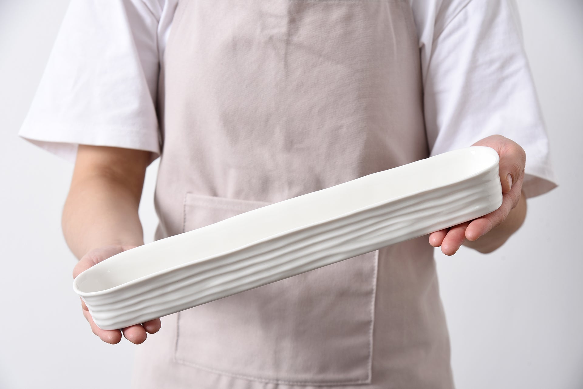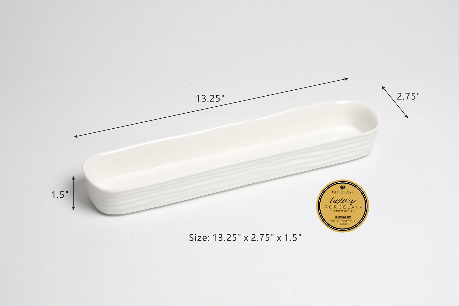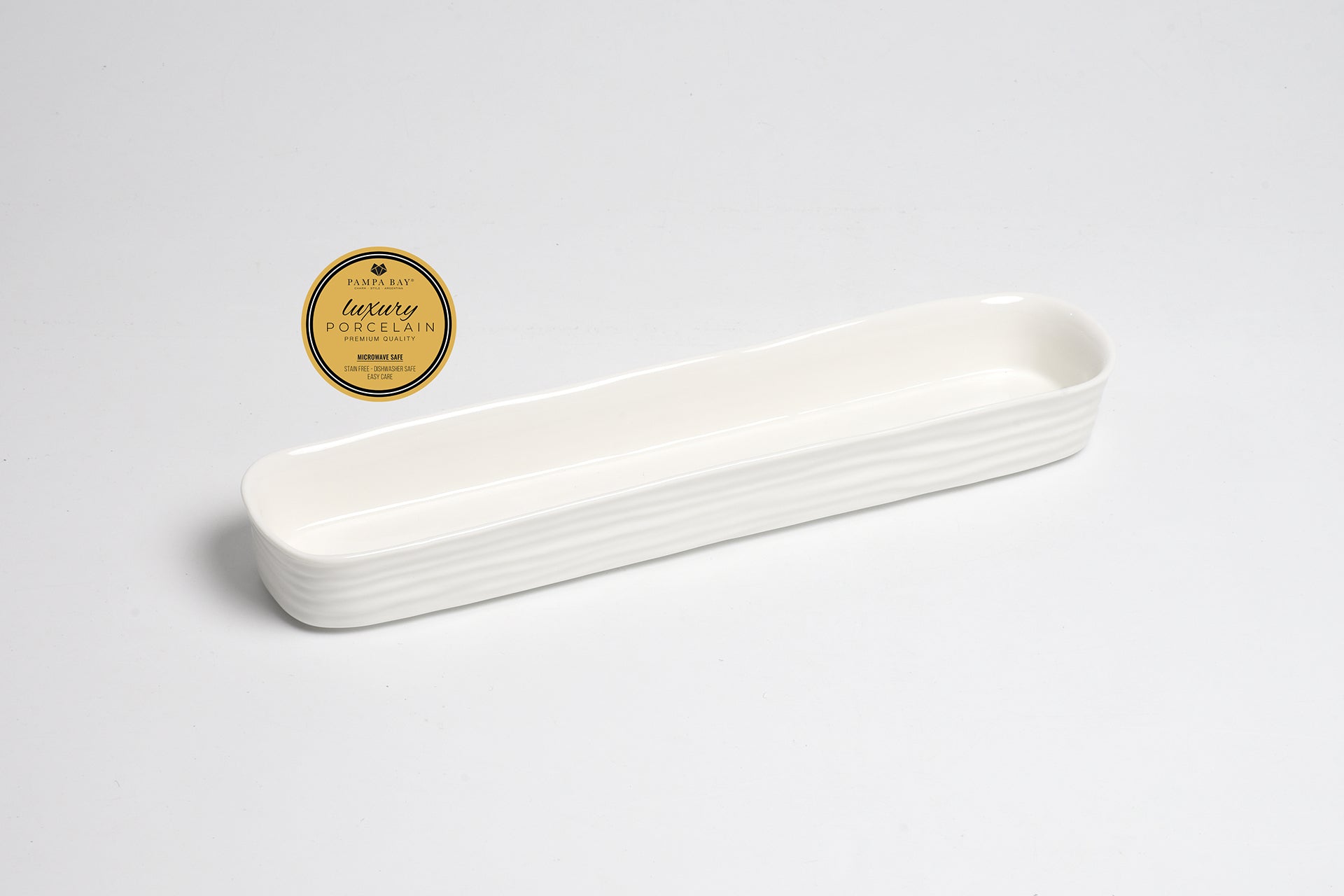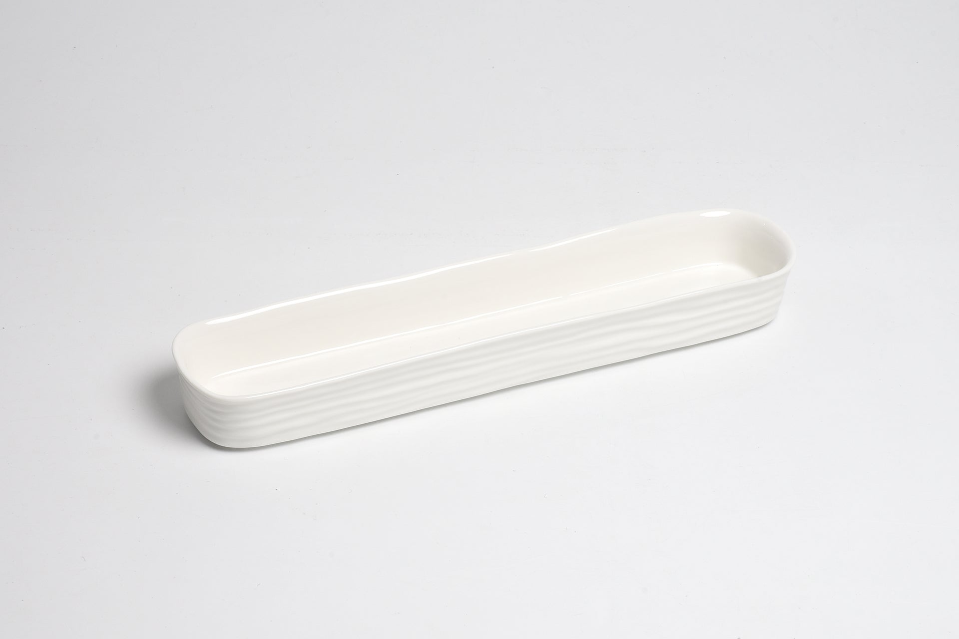 Cracker Tray in our Le Blanc Collection. Perfect for crackers, small cookies and other small treats. Versatile high-fired porcelain pieces that are microwave safe! Beautifully crafted with clean lines and organic shapes. Food safe, tarnish free, dishwasher safe, oven safe to 500°F. Easy Care.
