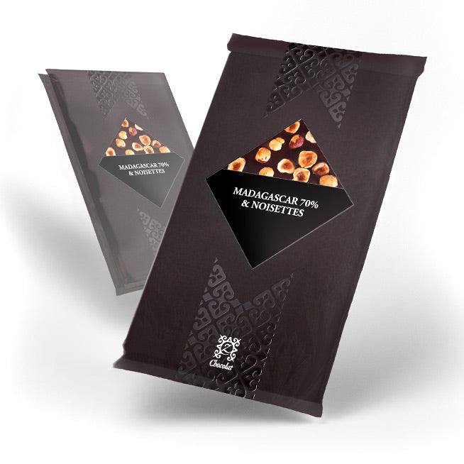 Count down to an appetizing adventure with three chocolate bars, featuring two distinct flavors and textures, in one amazing assortment. Boldly blending the bitter and the brittle, each beautiful bar capriciously coats the flavorful richness of crisp and crunchy, slow-roasted premium hazelnuts from Piedmont, Italy with a uniquely intense 70% dark chocolate to enhance its honey-tinged aroma. This delectable duo of decadently dark chocolate and heavenly hazelnuts is the ideal French-Italian indulgence.
