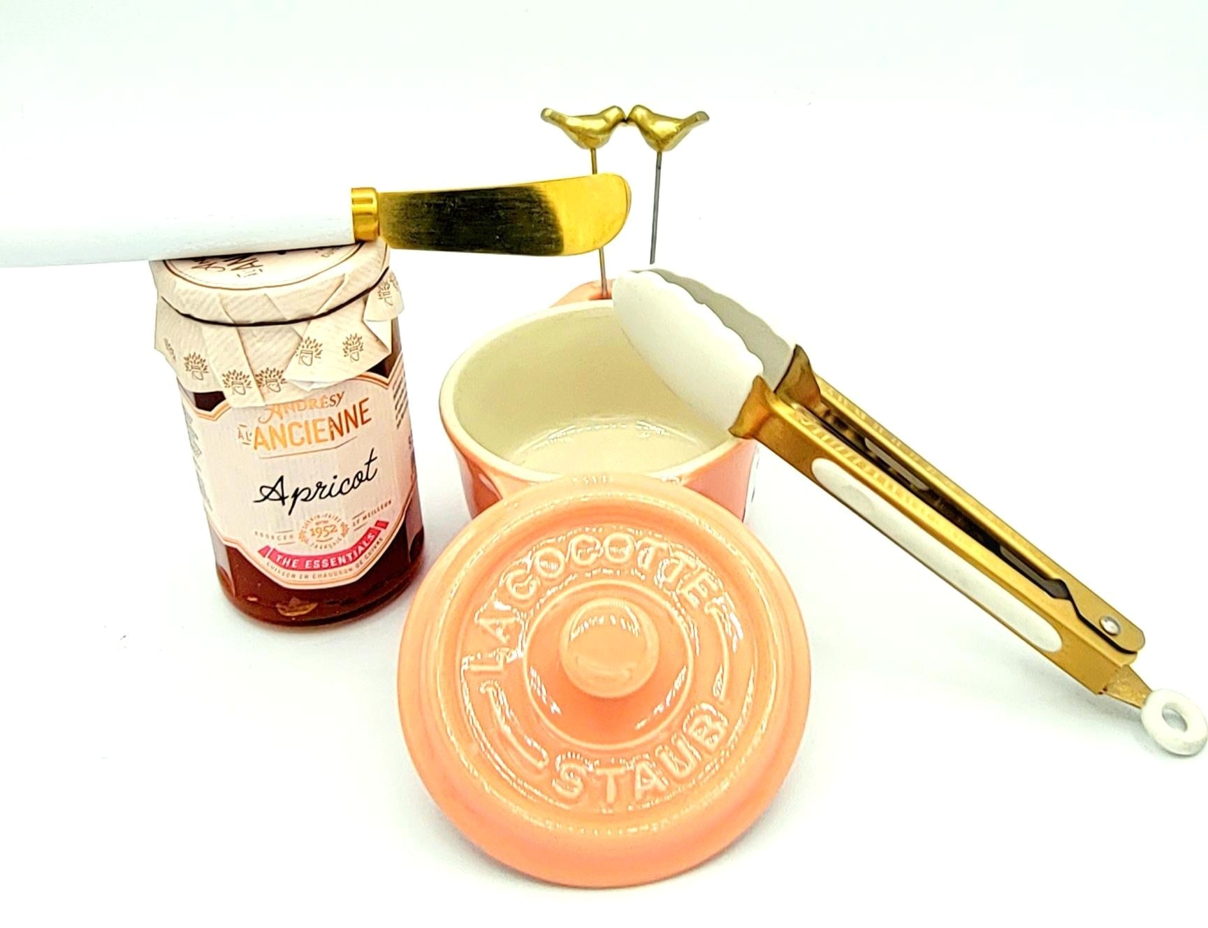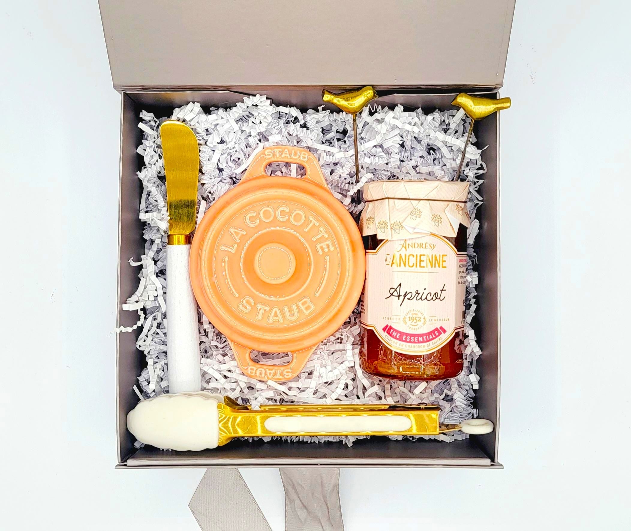 Enjoy a shared experience of fondue or dipped chocolate covered strawberries with a pair of brass bird picks. Your French inspired box includes a French apricot spread that can be spread on a tasty croissant.