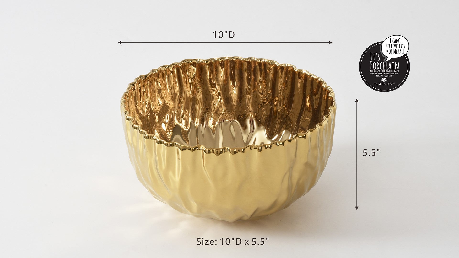 Large Bowl in Mascali d'oro. Generously sized bowl for serving salads or side dishes like mashed potatoes, roasted vegetables, or rice! Striking and elegant gold-tone finished high-fired porcelain. Food safe, tarnish-free, dishwasher safe, oven safe to 500°F. Easy Care.