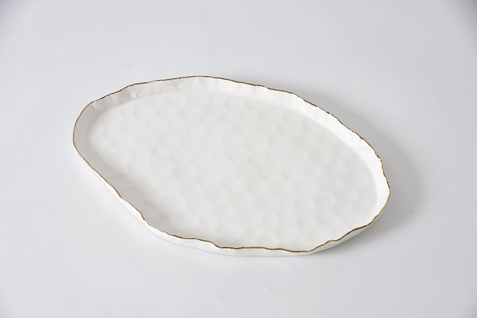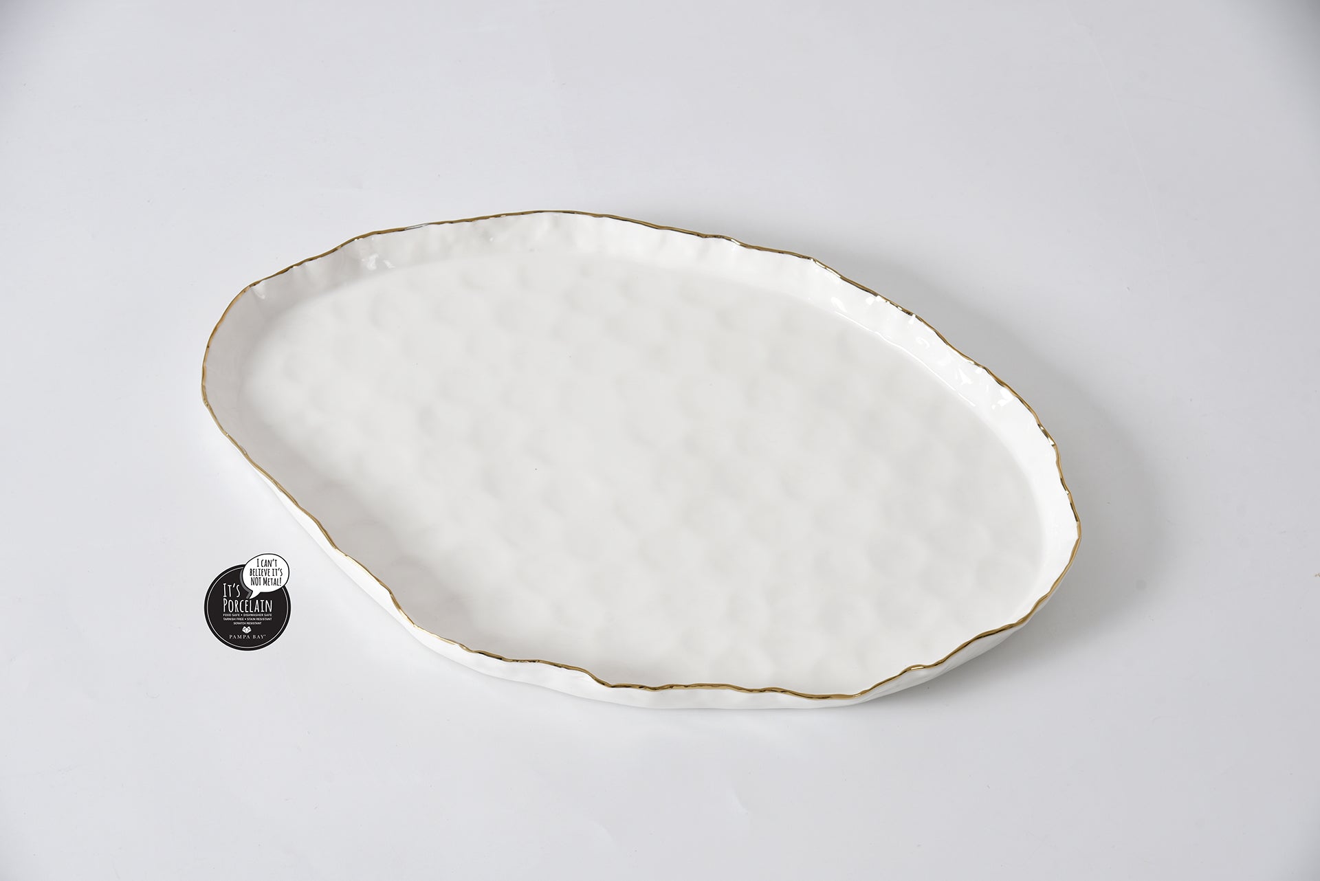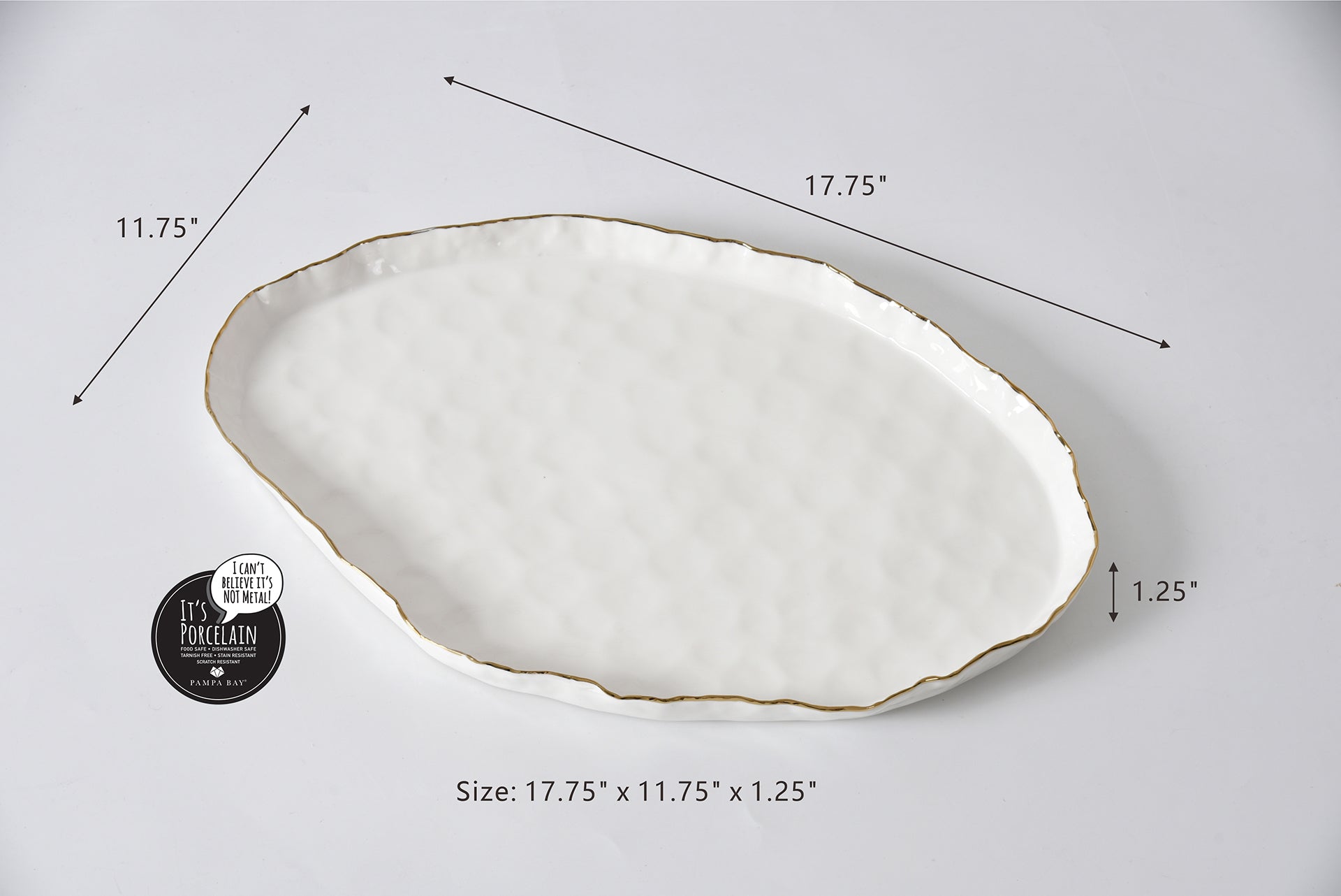 Large Oval Platter in Portofino. Perfect for tempting guests with your delicious main course or hearty sides. Use for dessert to display an assortment of treats and sweets! Gorgeous white porcelain with a delicate gold trim. Food safe, tarnish-free, dishwasher safe, oven safe to 500°F. Easy Care.