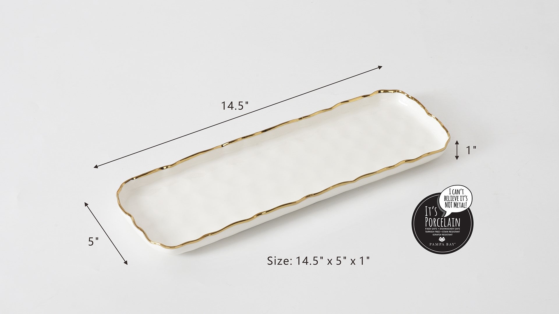Long Rectangular Tray in our Portofino Collection. Suits all types of tables and is plenty chic for elegant occasions! Perfect for serving side dishes, appetizers, and desserts. Gorgeous white porcelain with a delicate gold trim. Food safe, tarnish free, dishwasher safe, oven safe to 500°F. Easy Care