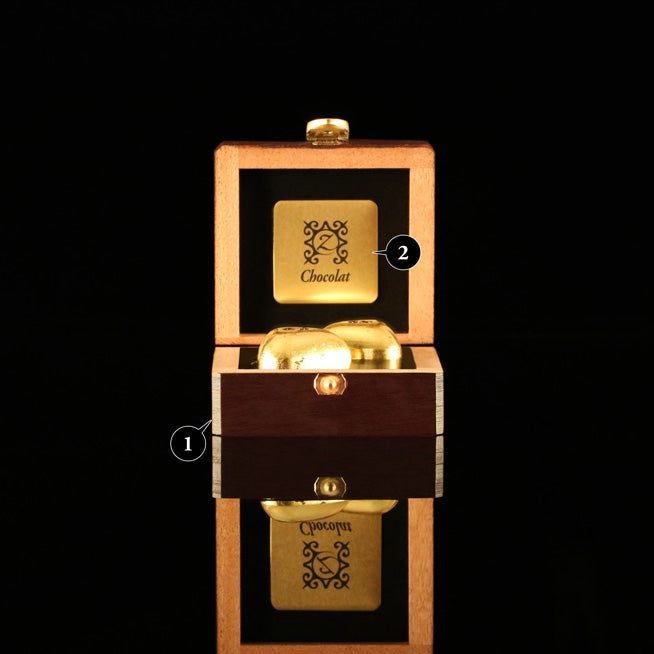 This luxurious treat, hand-crafted with premium ingredients by industry experts, offers a captivating experience with its golden touches. Featuring two heart-shaped confections enveloped in 24K edible gold leaves, the decadent filling is a blend of dark ganache infused with Piedmont hazelnut praliné. The exquisite creation is encased in a combination of 70% dark chocolate couverture from Venezuela and Madagascar, presenting an exceptional and romantic indulgence. Packaged in a hand-crafted mahogany box, this confection exudes elegance and opulence.