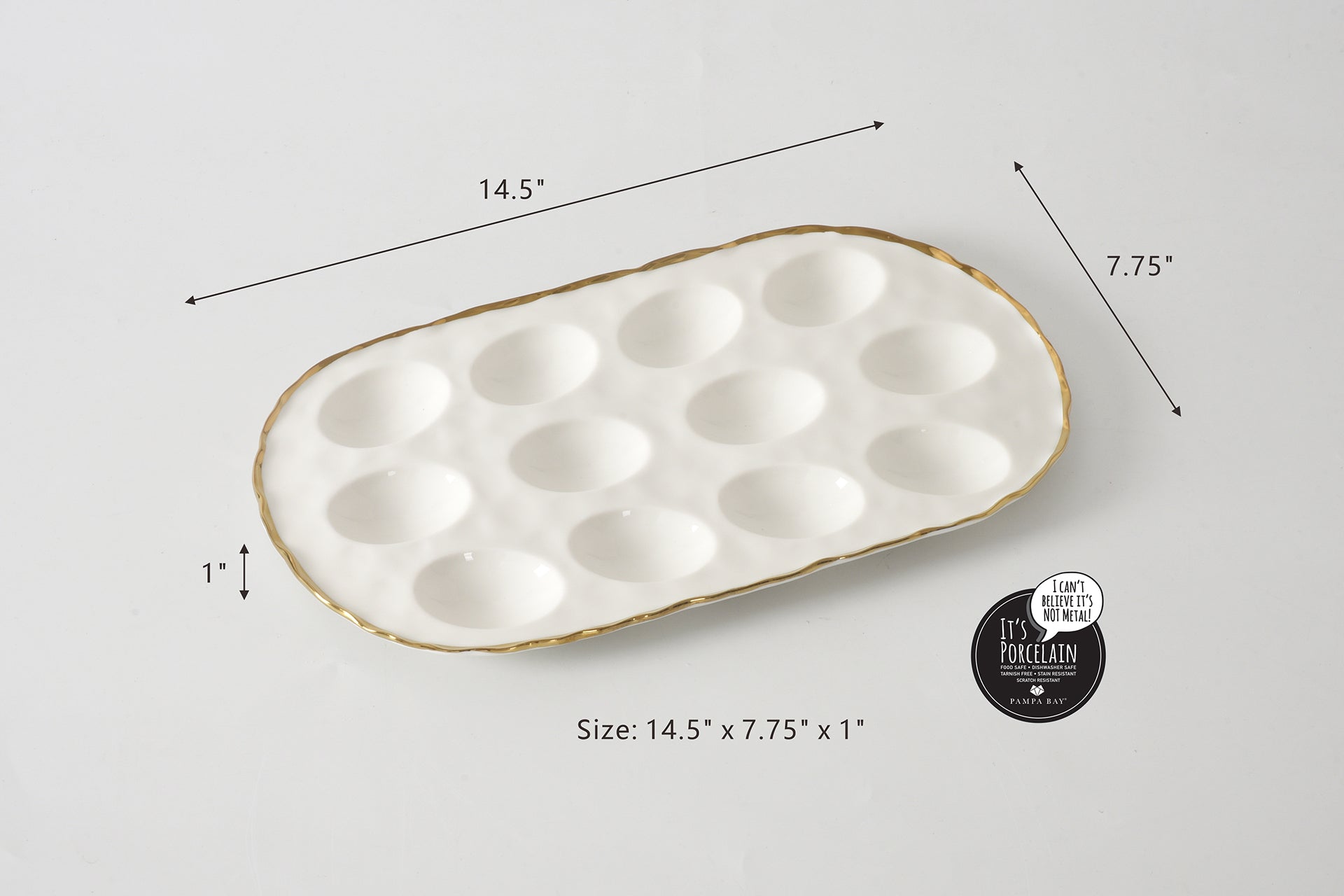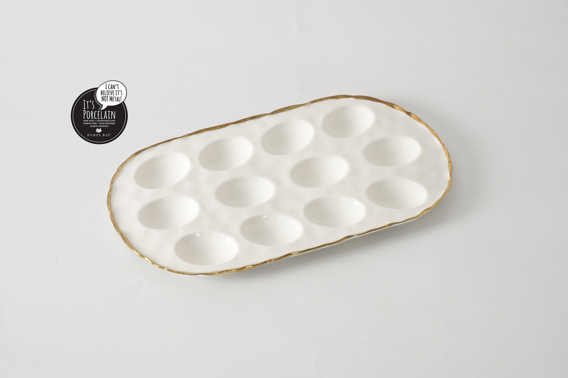 Oval Deviled Egg Tray in Portofino. The perfect accompaniment to relaxed weekend brunches, annual Easter celebrations or a fun night in, our egg tray is a great centerpiece for more than just eggs! Use to display a dozen deviled eggs at brunch or your beautifully decorated Easter eggs. This tray also makes for a great sushi display for a fun night in. Chill in the refrigerator first to keep food fresh and tasty when served. Gorgeous white porcelain with a delicate gold trim. Dishwasher safe, stain resistant, tarnish free, oven safe. Tarnish and stain-free. Easy Care.