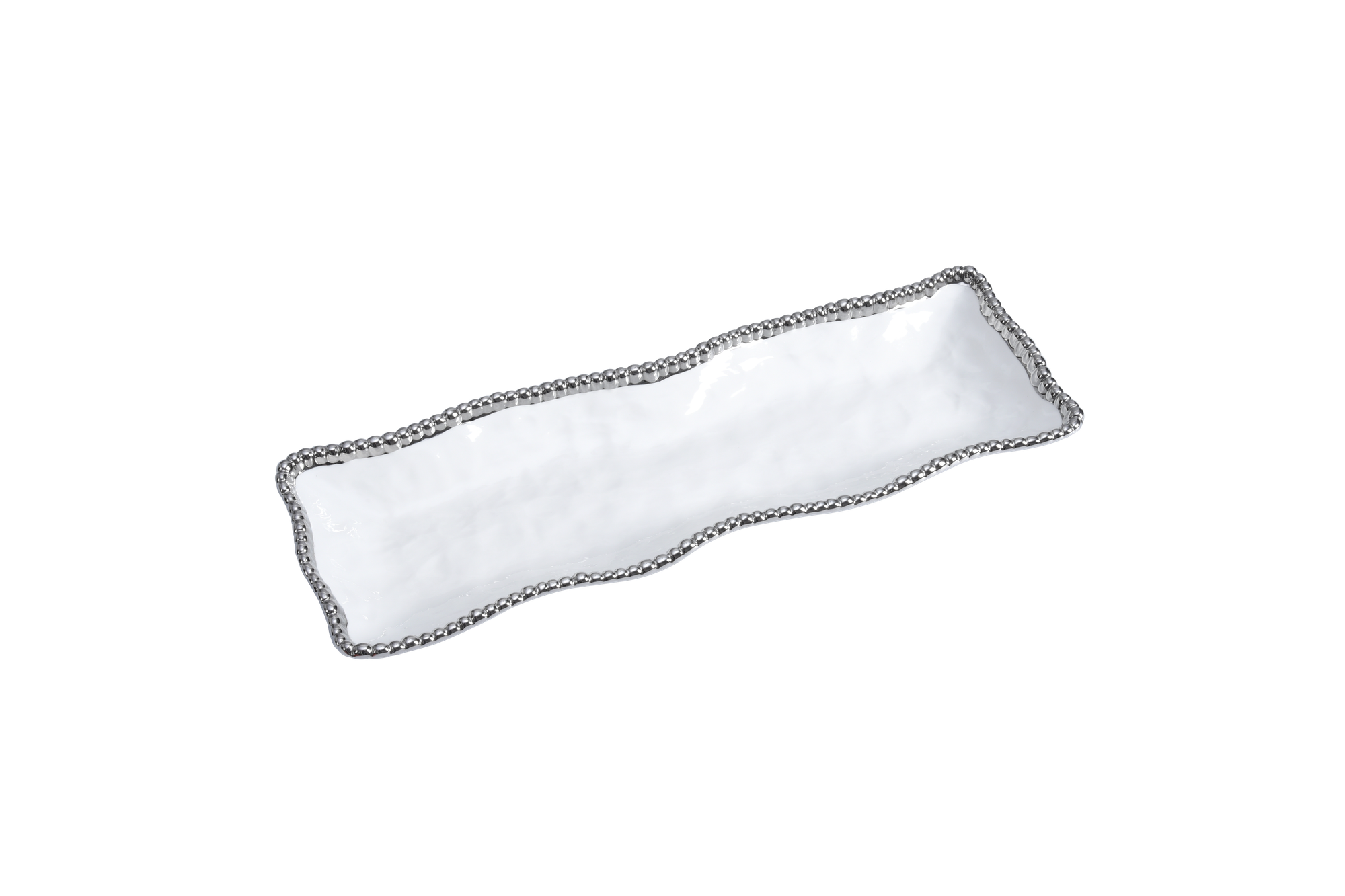 Rectangle Serving Piece serving platter in Salerno. Ideal for appetizers, cookies, and fruit. Unusual rectangular shape complements many table setting styles. Great on buffets where counter space is at a premium. Gleaming white porcelain with lustrous silver beads in titanium. Food safe. Dishwasher safe. Oven safe to 500°F. Easy Care.