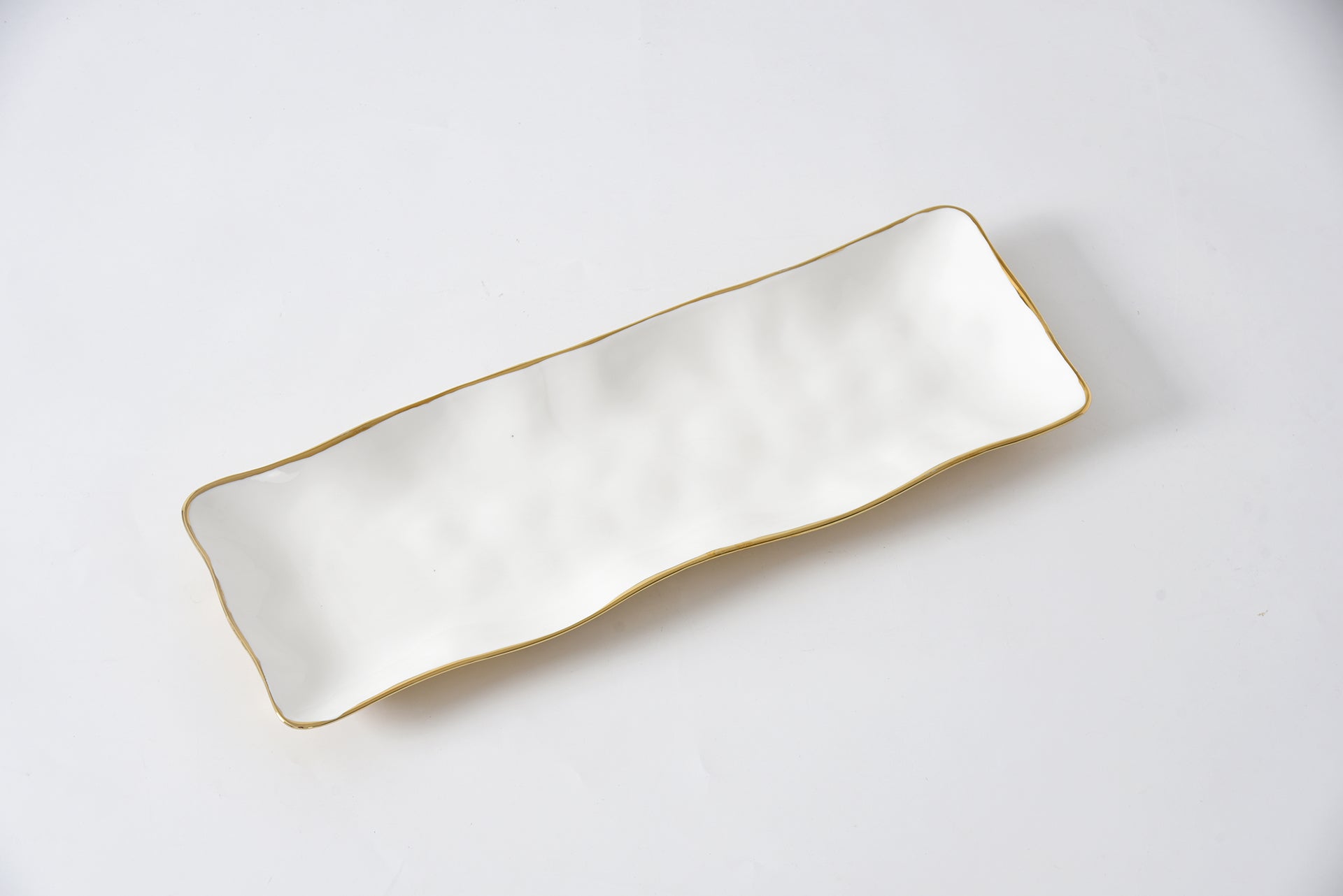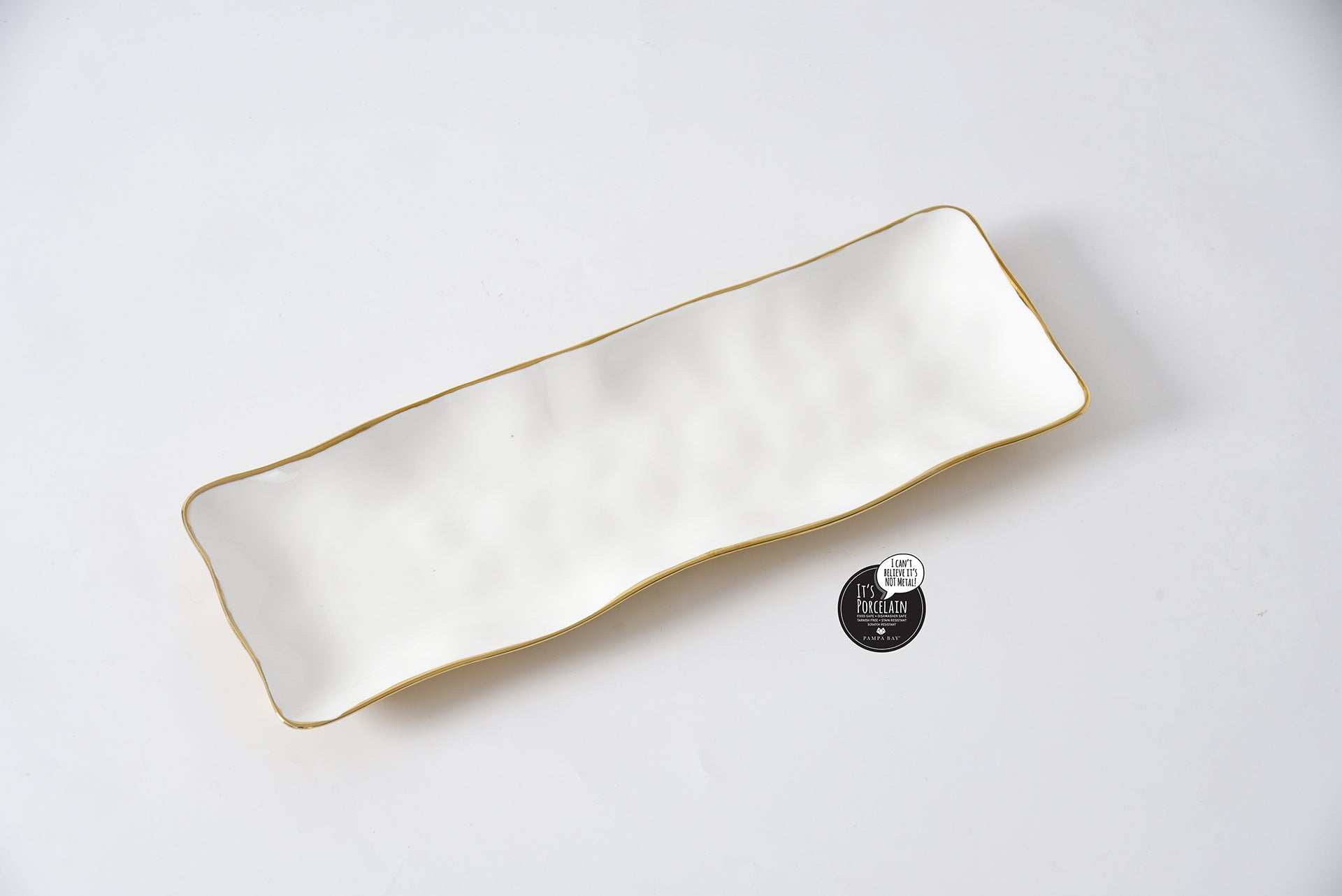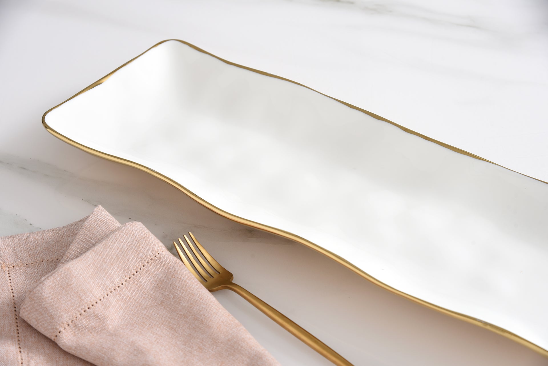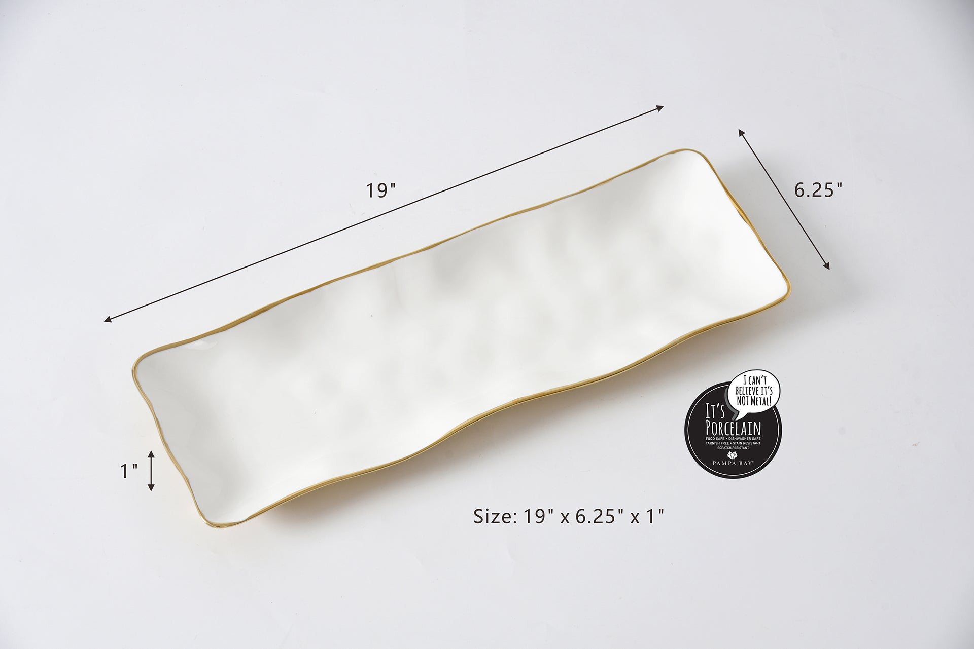 Rectangular Serving Piece from our Moonlight Collection. This incredibly versatile all-purpose serving platter makes an easy transition from oven to table. Show off your delicious appetizers, side dishes, and desserts on this beautiful platter! Striking and elegant gold-tone titanium-finished high-fired porcelain. Food safe, dishwasher safe, oven safe to 500°F. Tarnish and stain-free. Easy Care.