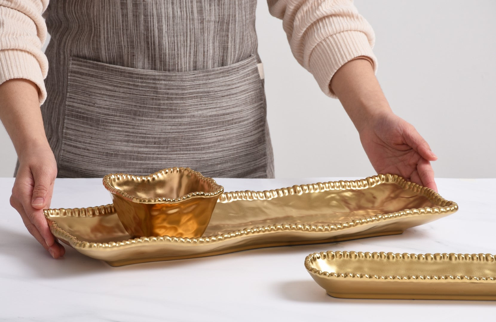 Rectangular Serving Platter in Monte Carlo. Ideal for appetizers, cookies and fruit. Unusual rectangular shape compliments many table setting styles. Great on buffets where counter space is at a premium. Crafted in a luxurious matte gold-toned high-fired porcelain with gold beads. Food safe. Dishwasher safe. Oven safe. Easy Care.
