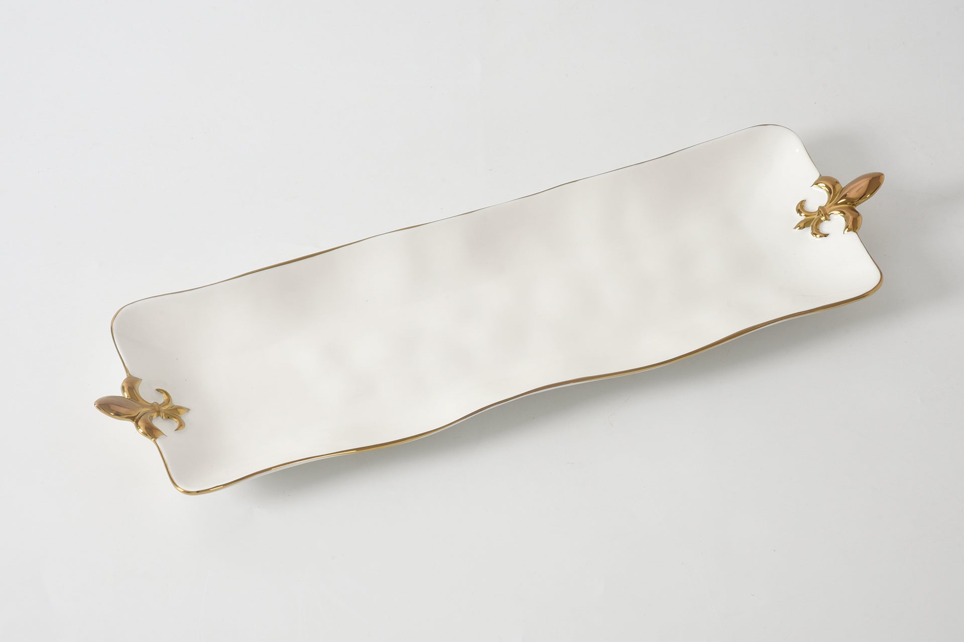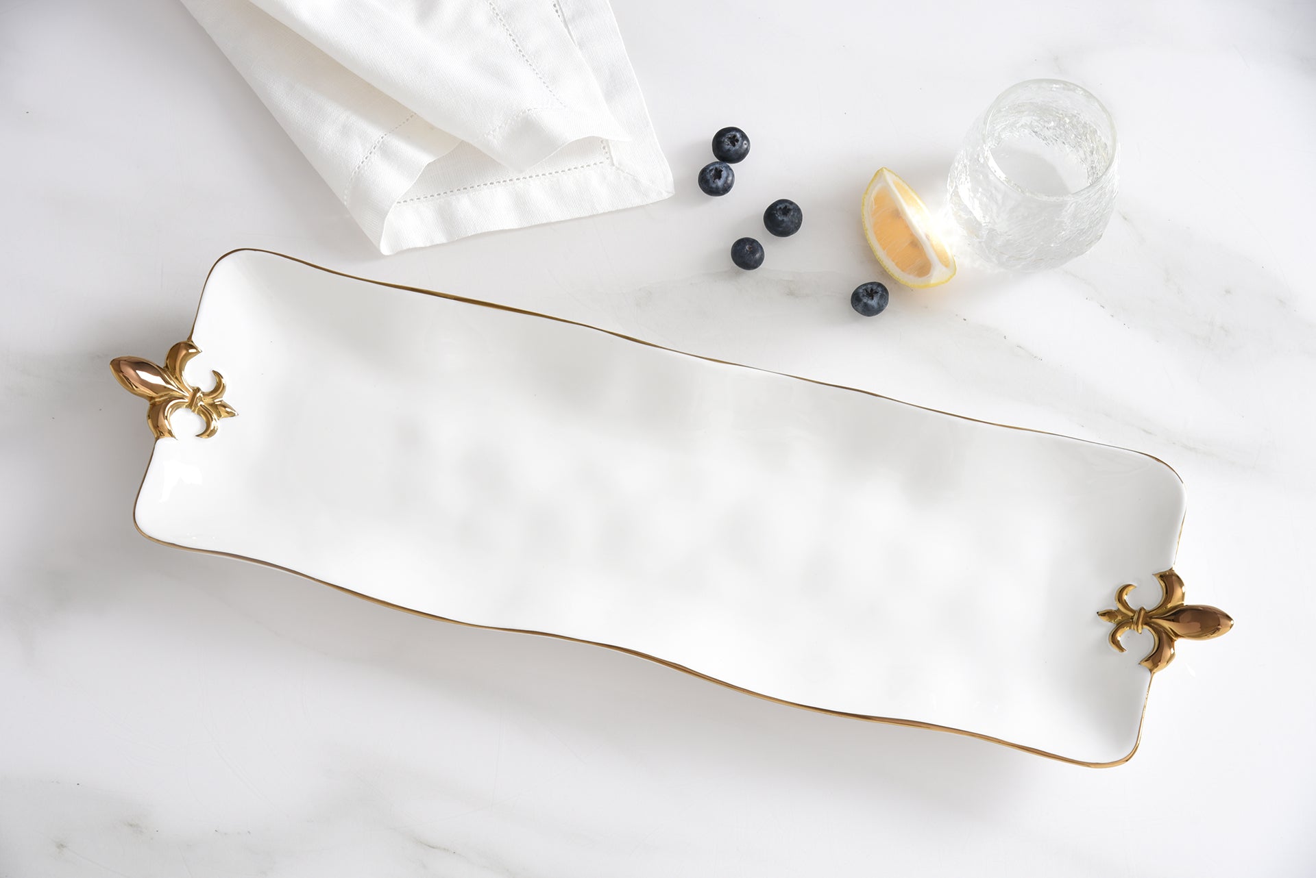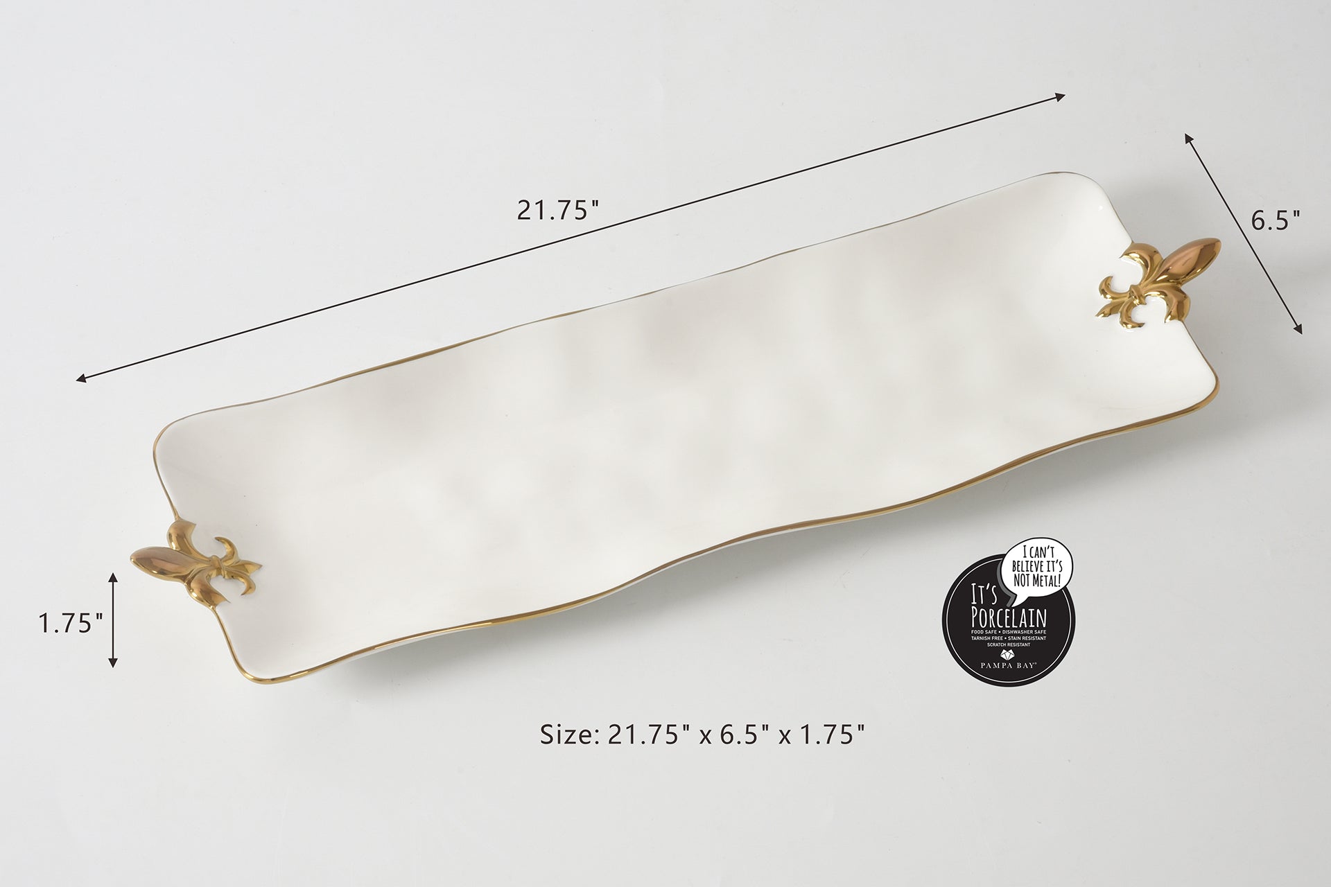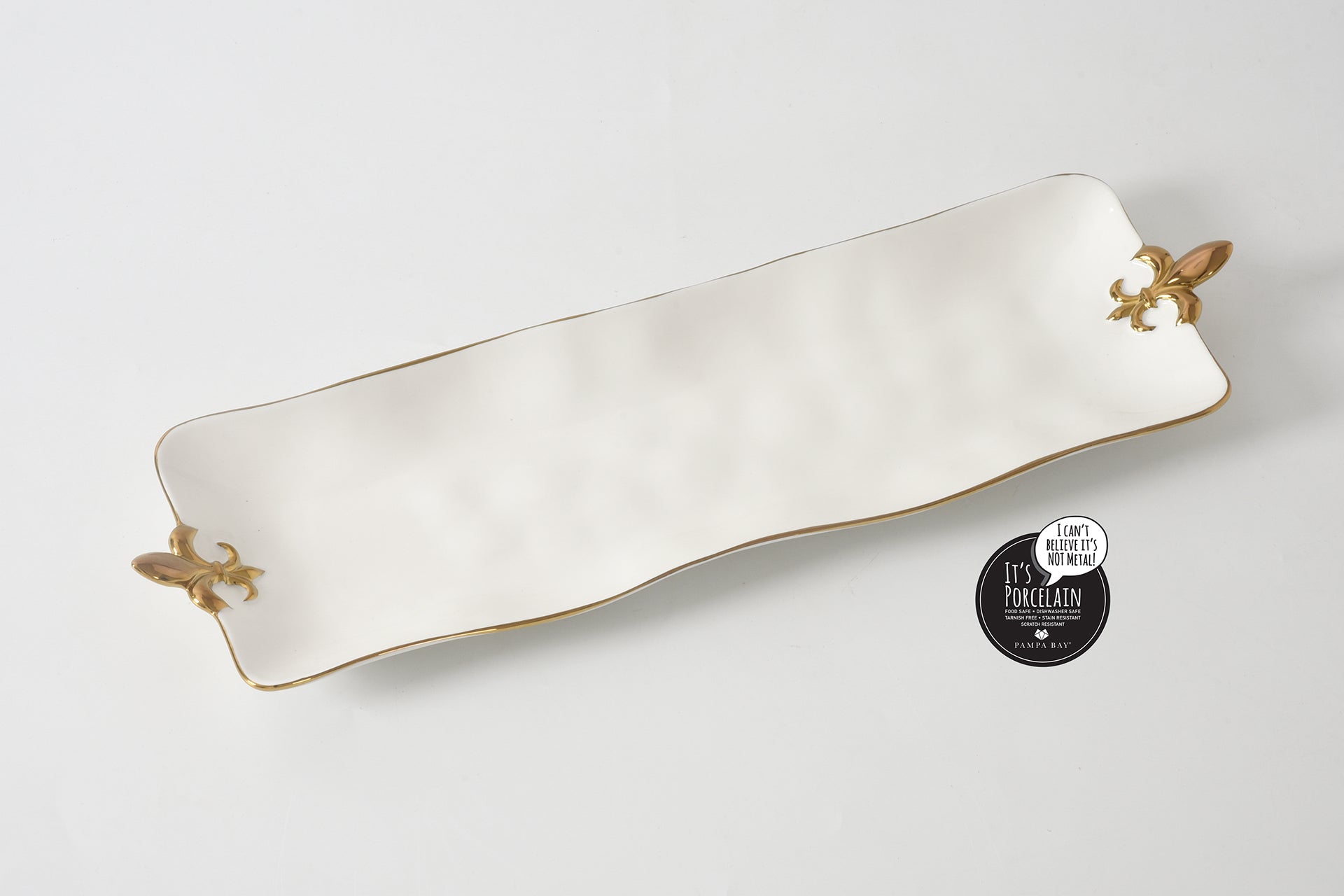 Add a royal touch to any dining experience with the Rectangular Serving Piece from our Fleur-De-Lis collection. An incredibly versatile all-purpose serving platter that makes an easy transition from oven to table. Show off your delicious appetizers, side dishes and desserts on this beautiful platter! Beautifully crafted in high-fired white porcelain with intricate gold detailing. Food safe, dishwasher safe, oven safe to 500°F. Tarnish and stain-free. Easy Care.