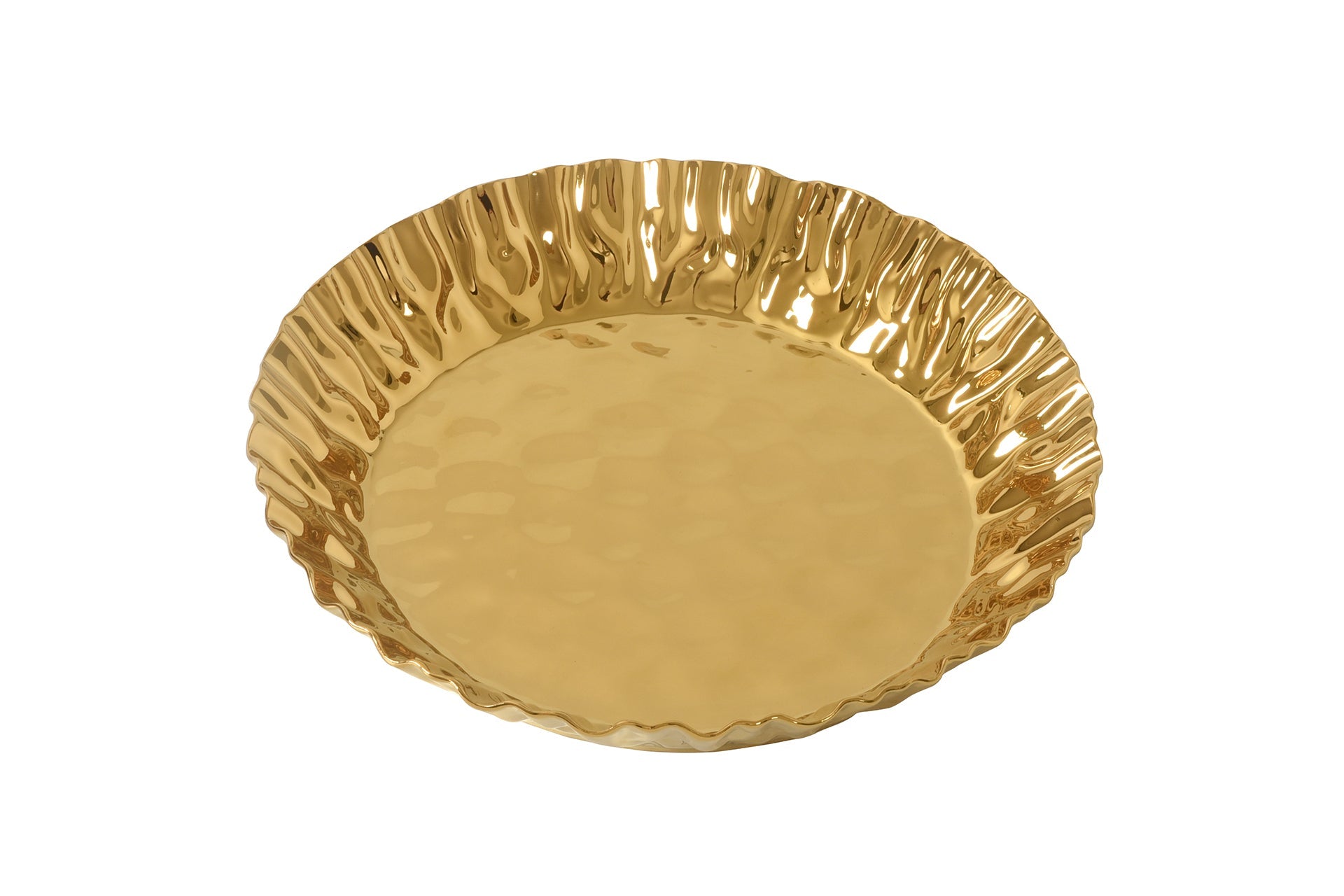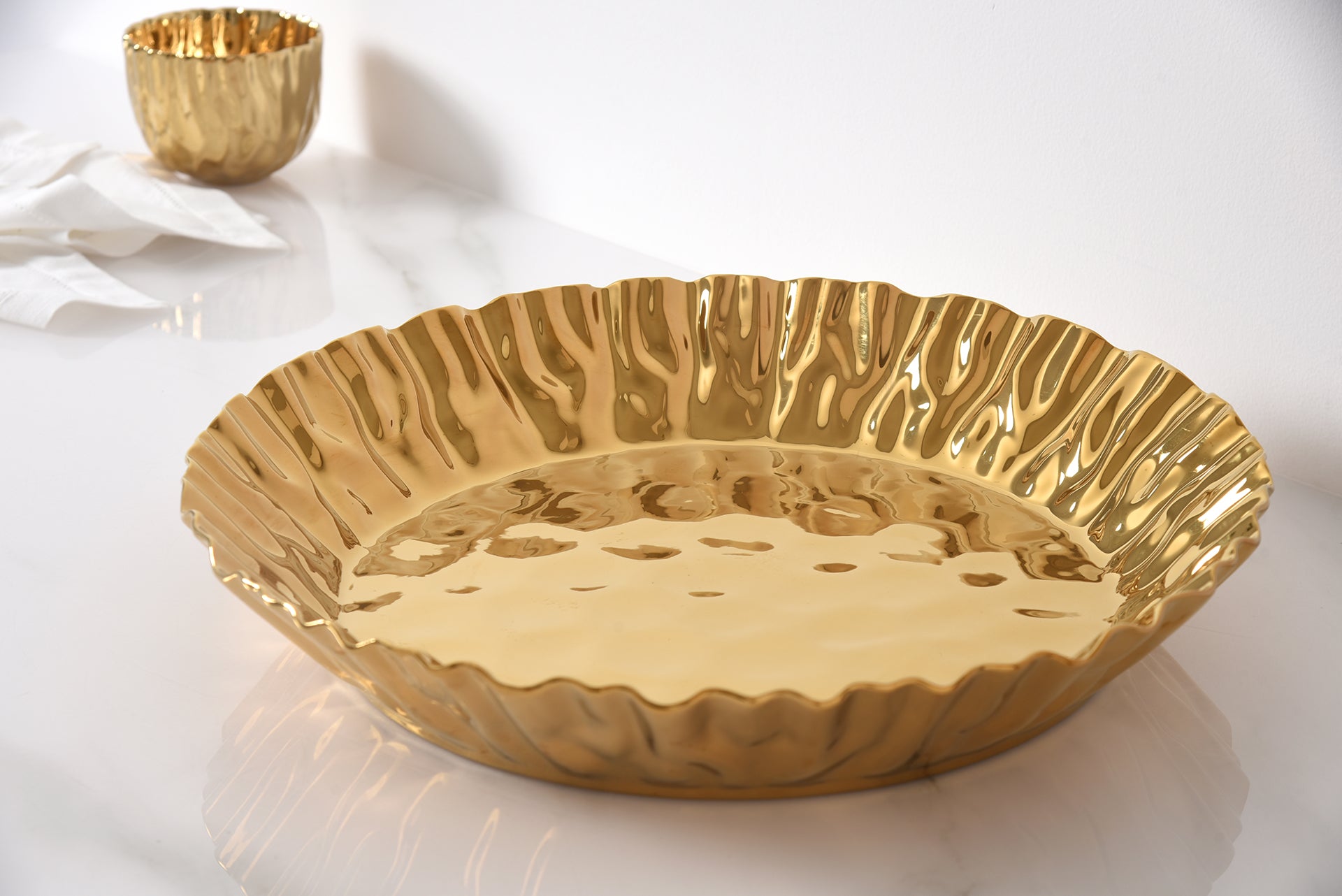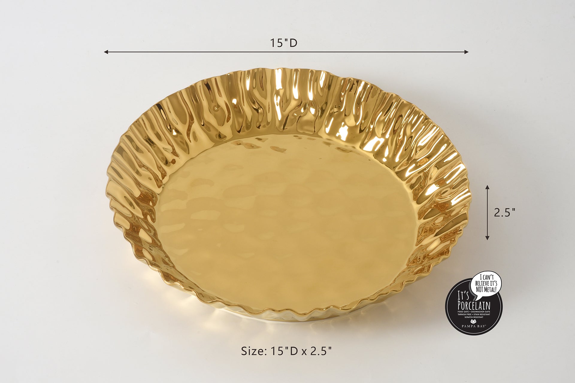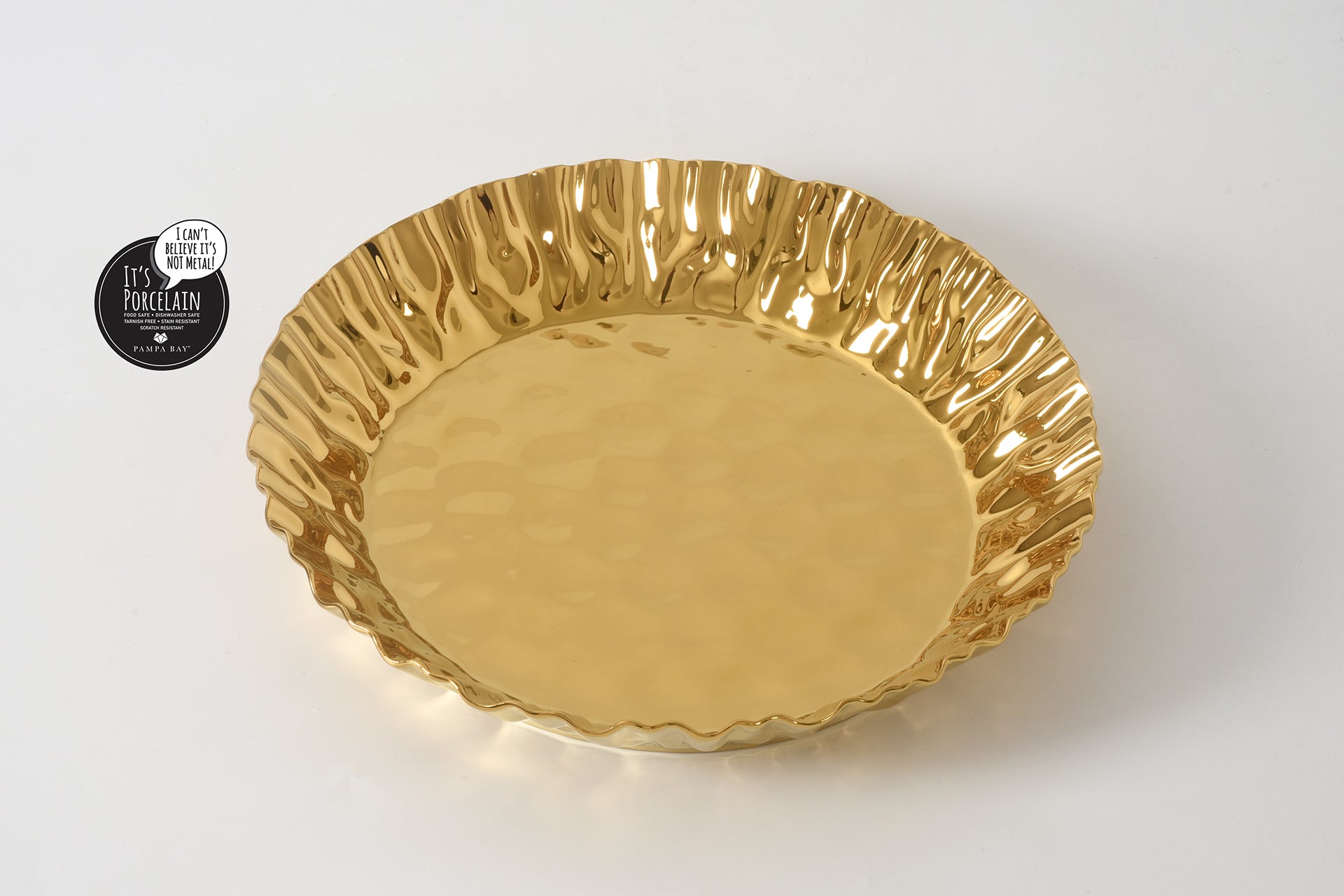 Round Deep Server in Mascali d'oro. A simple and elegant serving piece for crowd-pleasing dishes like paella, chicken piccata, and fettuccini alfredo. A perfect countertop piece to display fresh fruits or vegetables! Striking and elegant gold-tone finished high-fired porcelain. Food safe, dishwasher safe, oven safe to 500°F. Tarnish and stain-free. Easy Care.