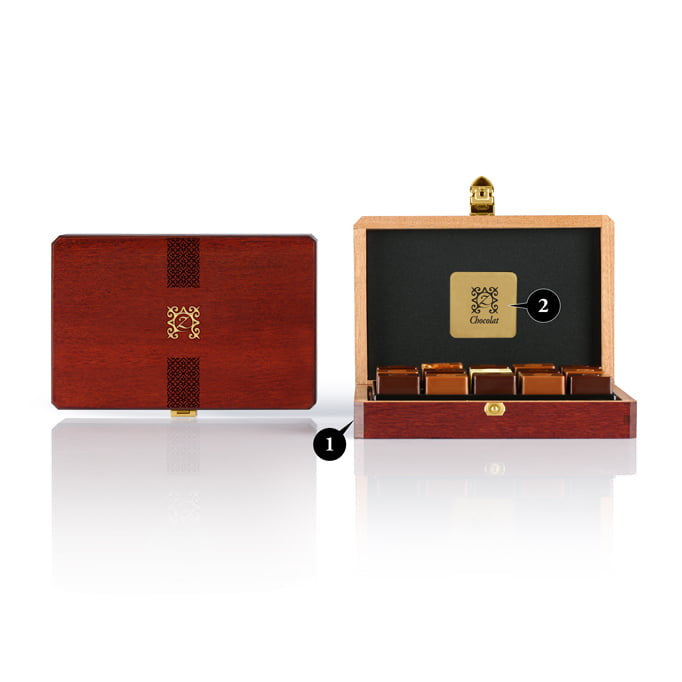 Kindly note that you can change the chocolate assortment, engrave the name of your gift recipient (❶) and/or the image of your choice (❷) on the box by selecting the corresponding option in the "Gifting services" section below.