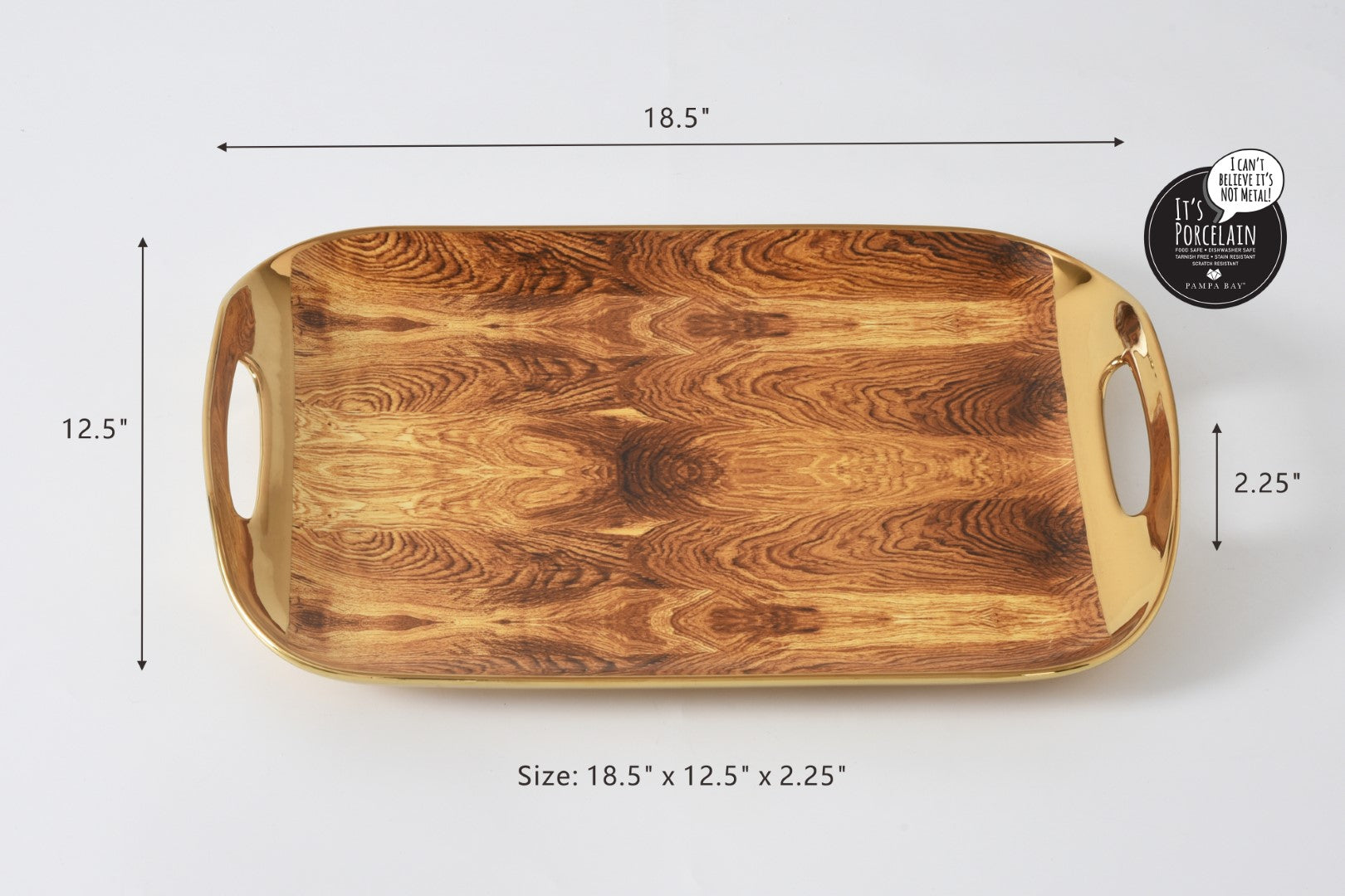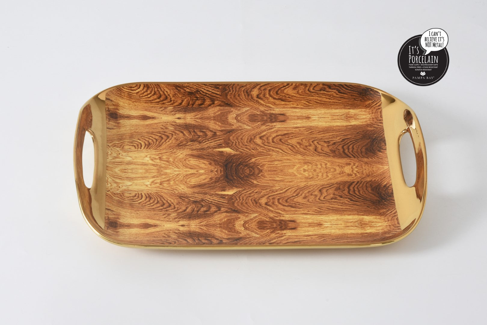 Serving Tray with Handles in Madera. Perfect for tempting guests with your delicious main course or hearty sides. Or use for dessert to display an assortment of treats and sweets! Stunning high-fired porcelain with a rustic wood design and gold-toned rim. Food safe, dishwasher safe, oven safe. Easy Care.
