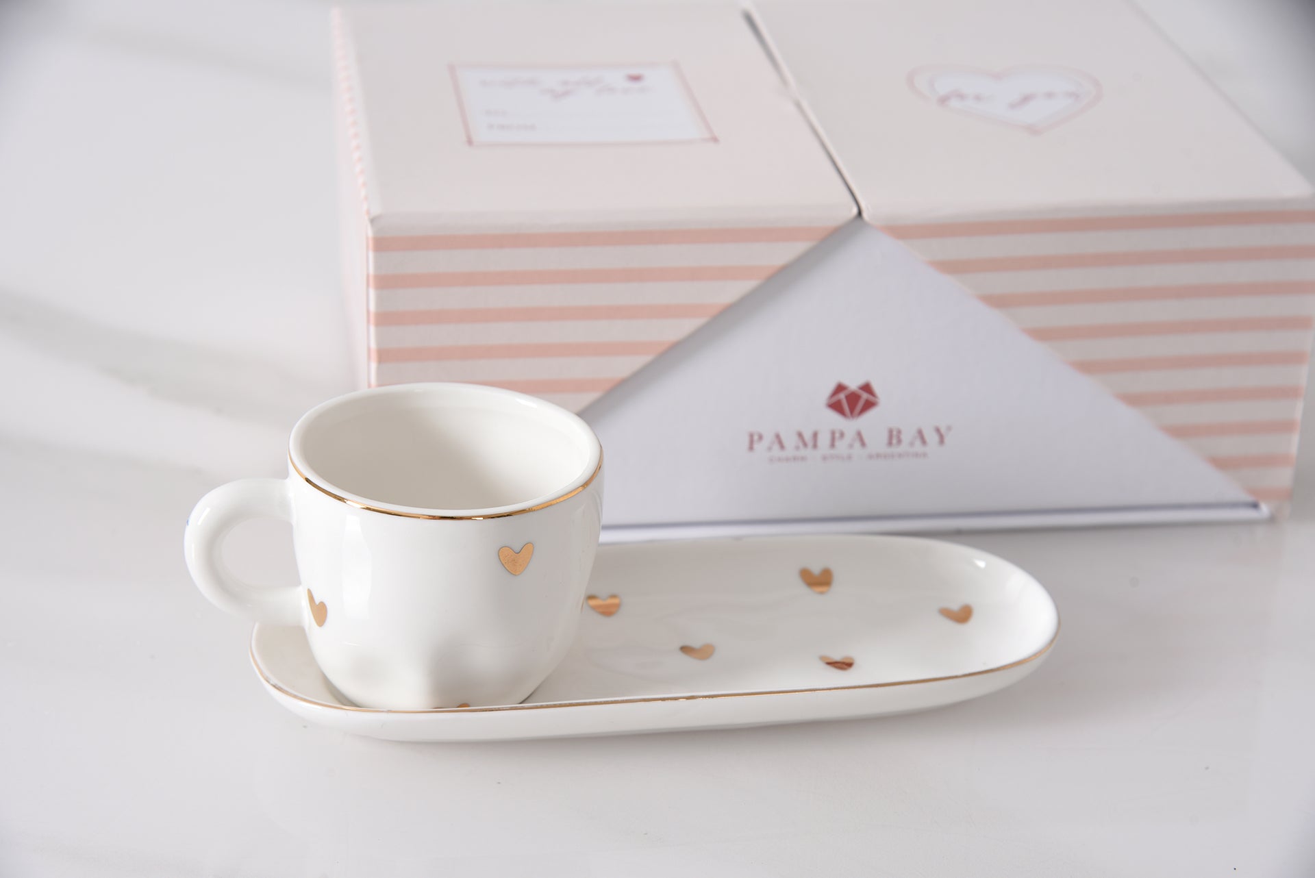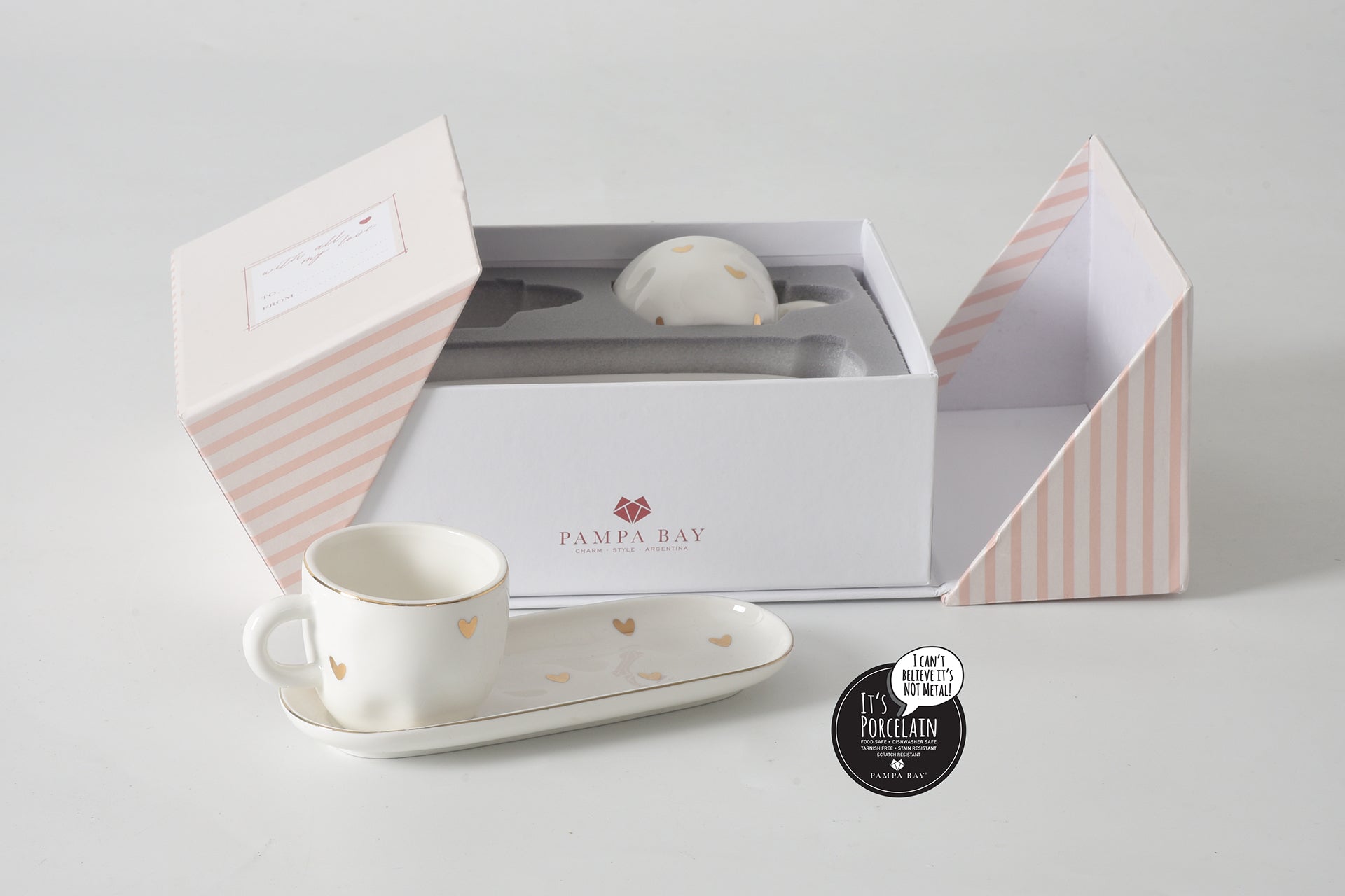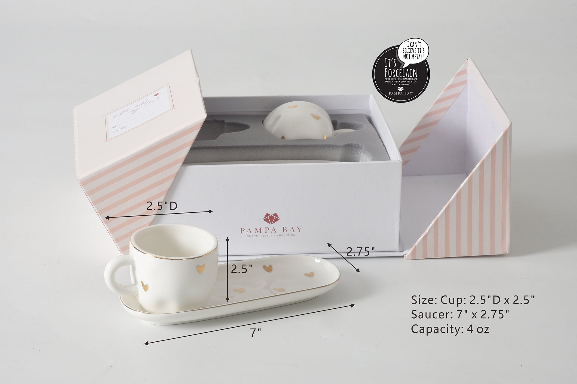 Set of 2 Espresso Cups & Saucers from our Heart to Heart Collection. Use for a fabulous brunch or delight guests by serving espresso in these gorgeous cups! Beautifully packed in a gift box, with a fun sentiment on the cover that can be personalized. The perfect housewarming or hostess gift! Crafted in a stunning white porcelain with delicate gold-tone decorations. Food safe, dishwasher safe, oven safe to 500 degrees F.