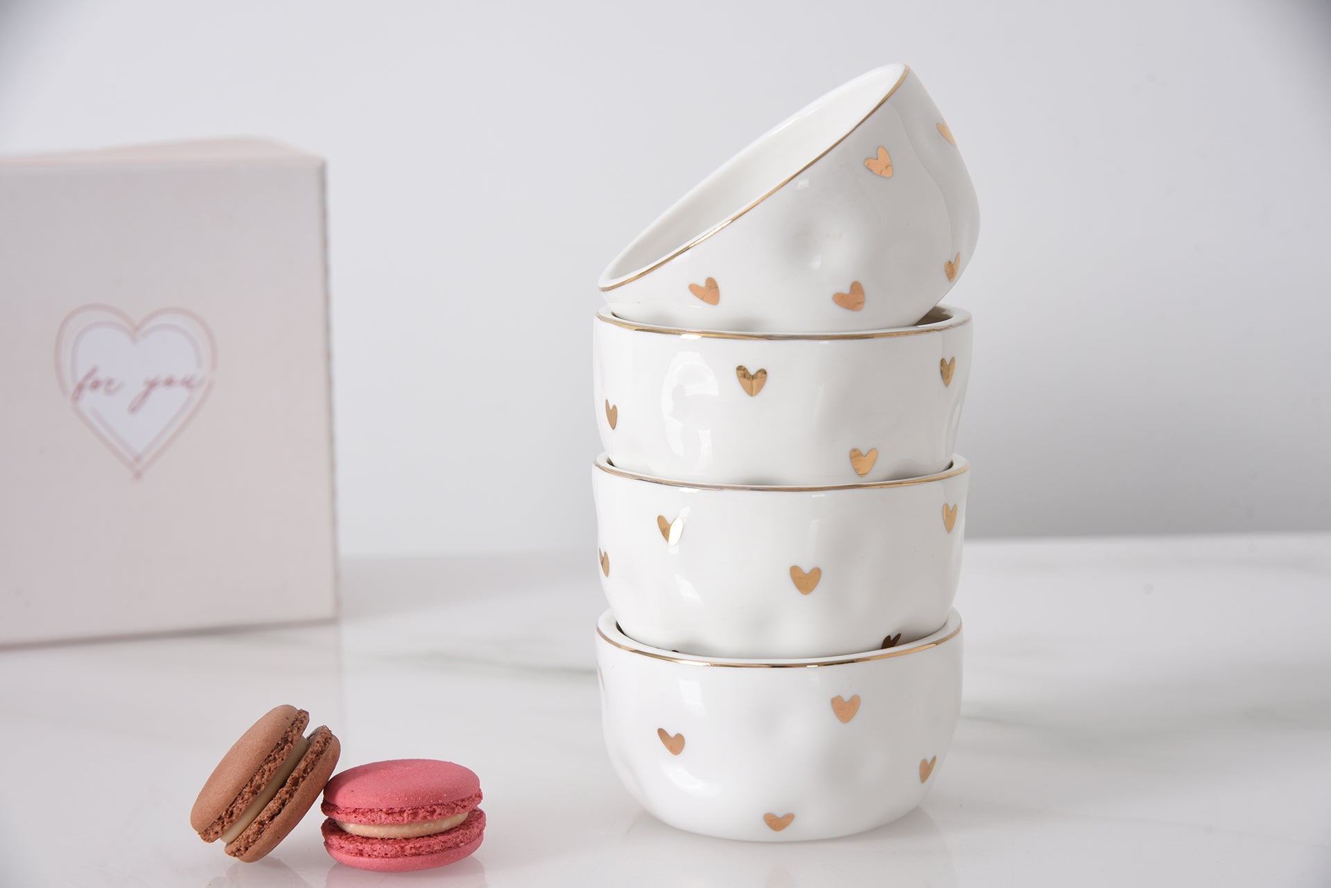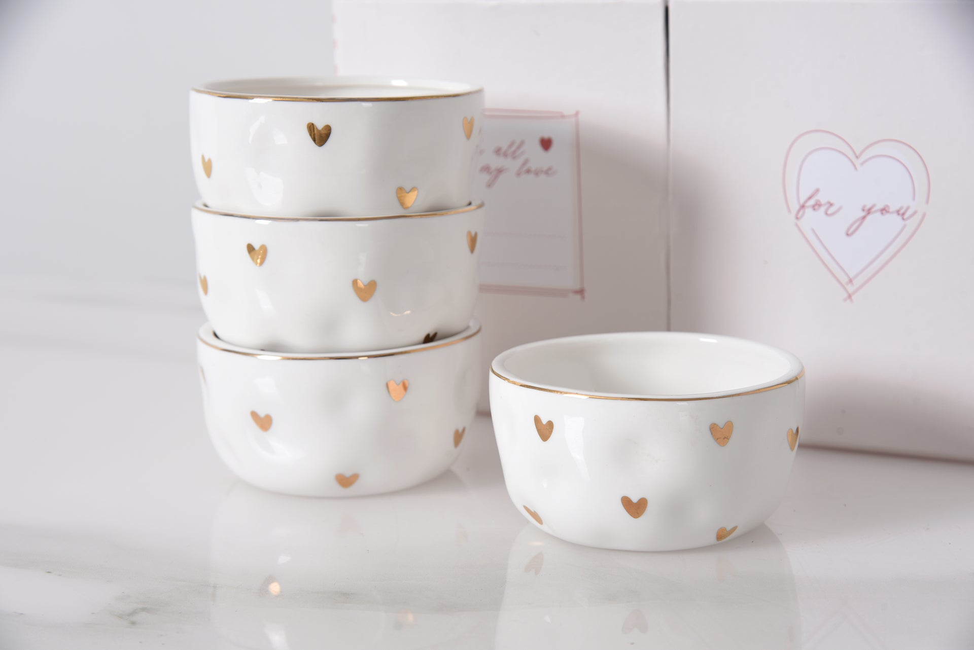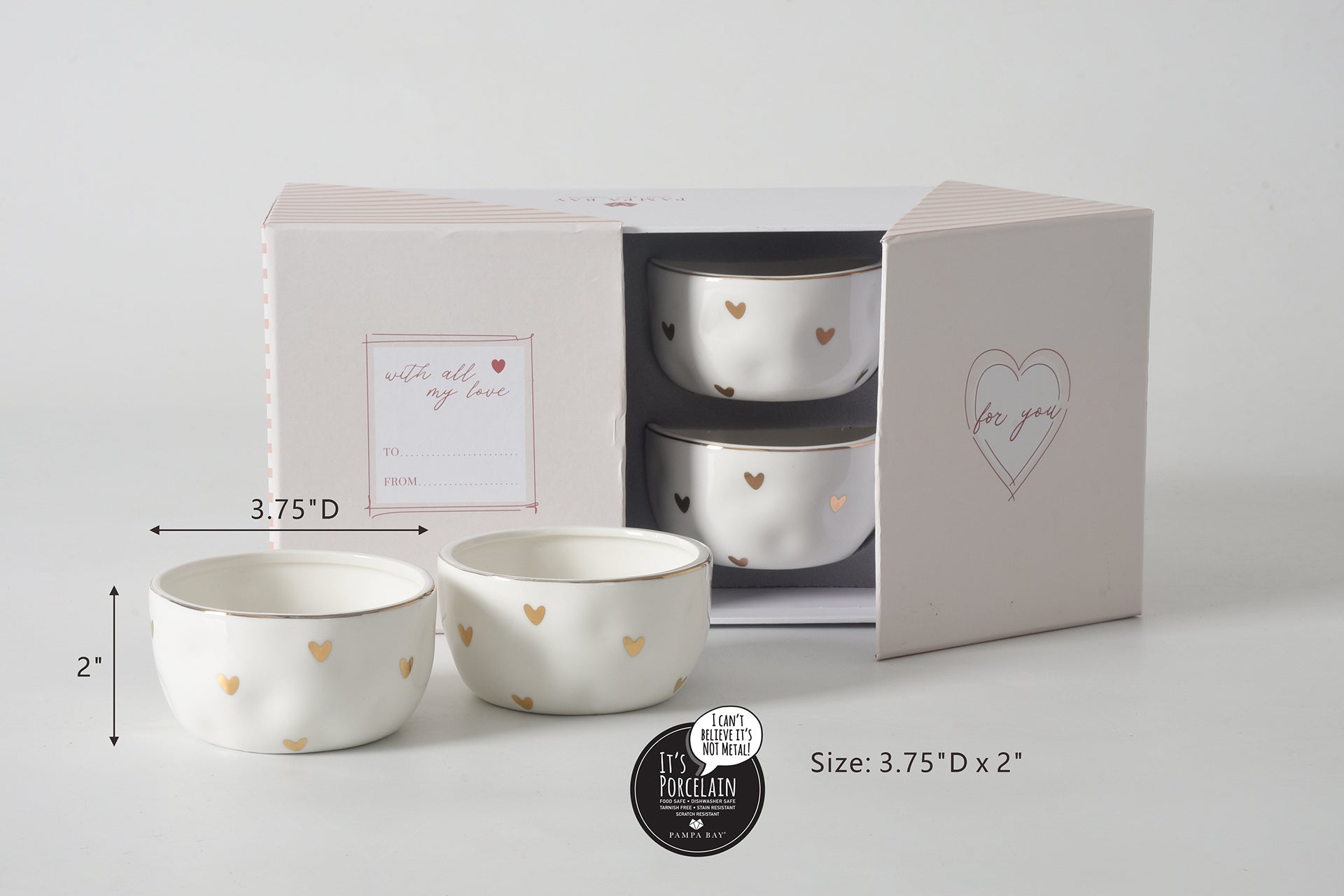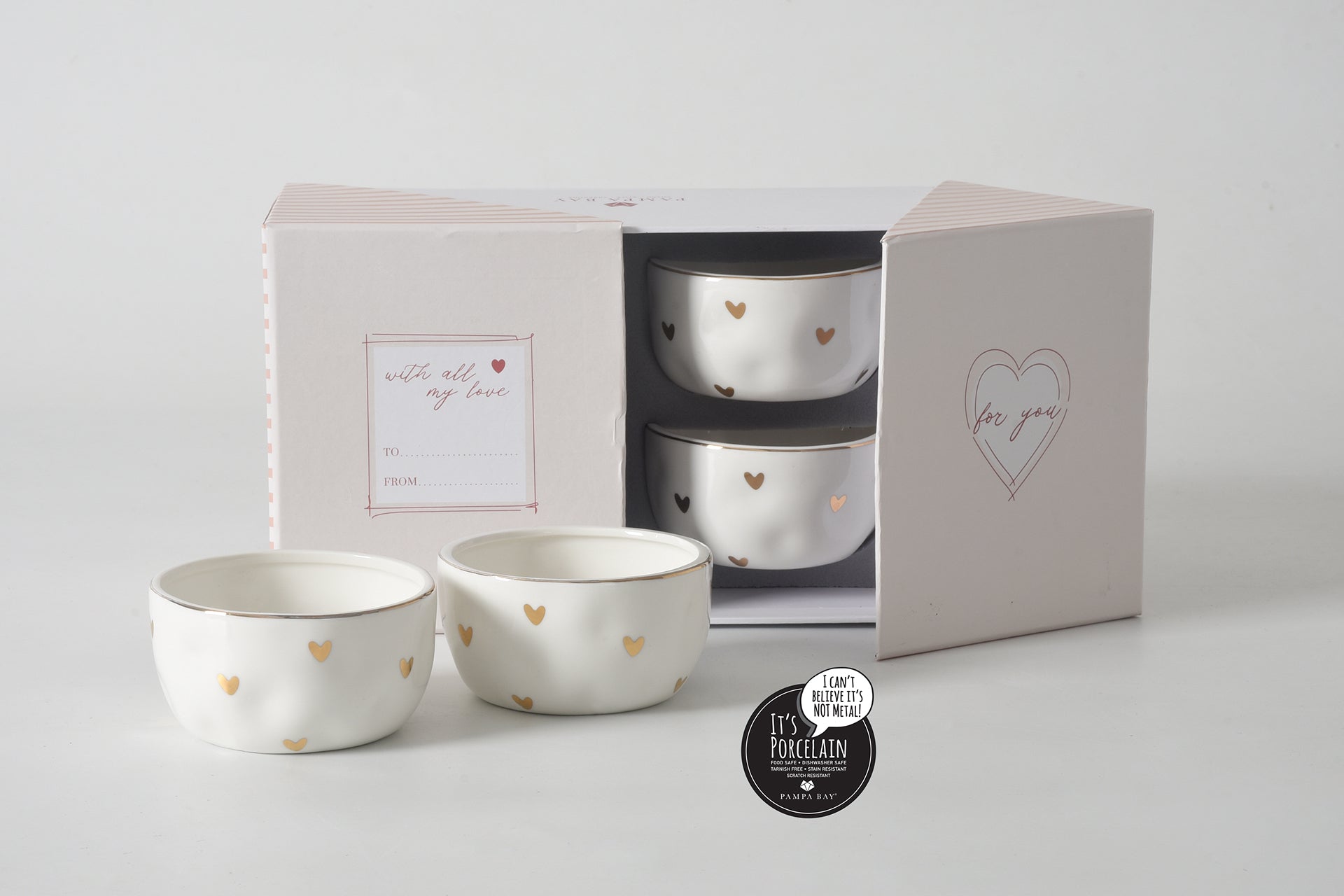 Set of 4 Snack Bowls from our Heart to Heart Collection. Perfect for mixed nuts, berries, candies, and dip. Crafted in a stunning white porcelain with delicate gold-tone decorations. Beautifully packed in a gift box, with a fun sentiment on the cover that can be personalized. Food safe, dishwasher safe, oven safe to 500 degrees F.