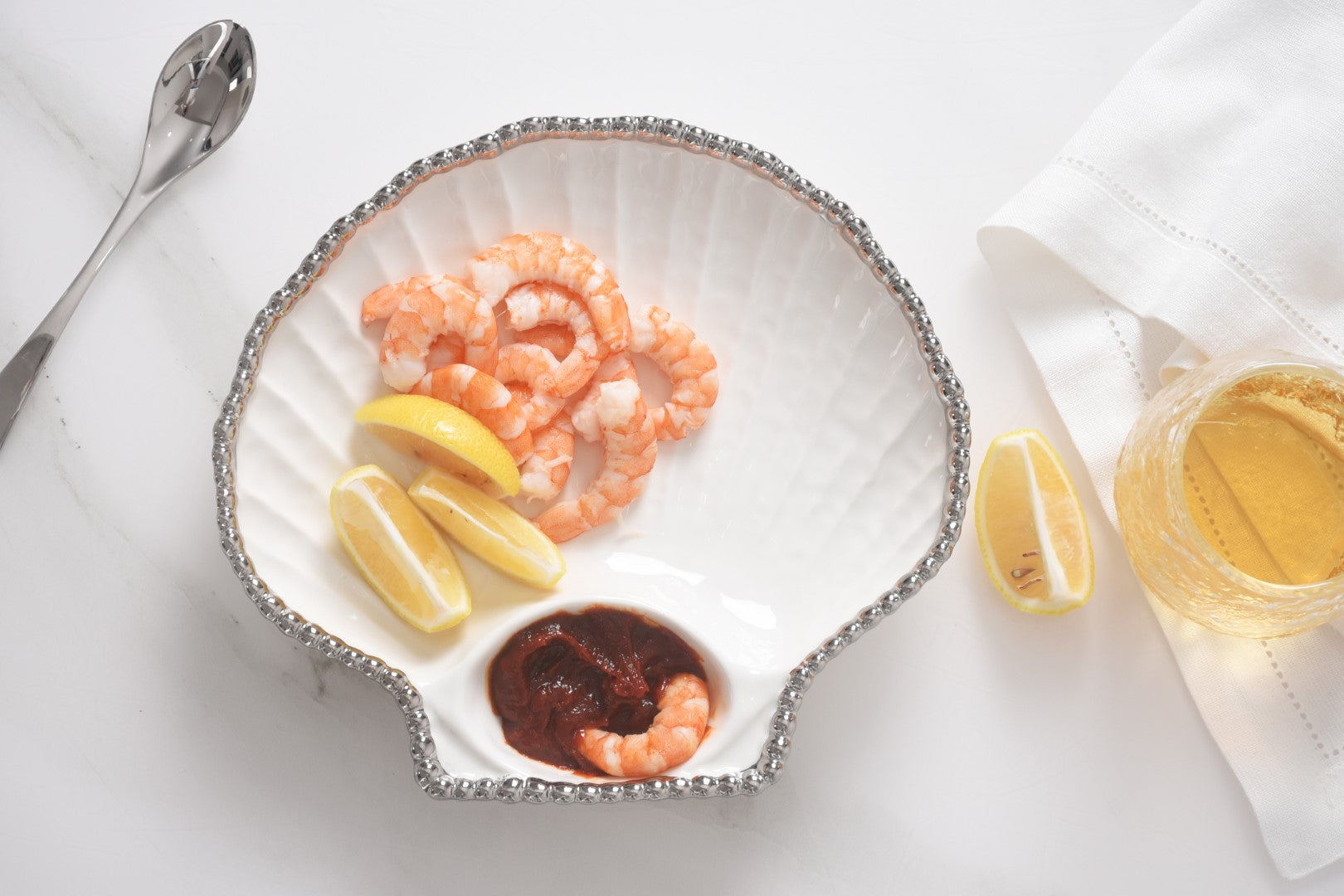 Bring the awe of the ocean to your table with this stylish Small Shell from our Salerno Collection. A charming gift for beach lovers and anyone who appreciates the beauty of the sea. Perfect for any dip combo: hummus and pita, salsa and tortilla chips, veggies and ranch or our favorite berries and whipped cream! Gleaming white porcelain with lustrous silver beads. Food safe. Dishwasher safe. Oven safe to 500 degrees F. Easy Care.