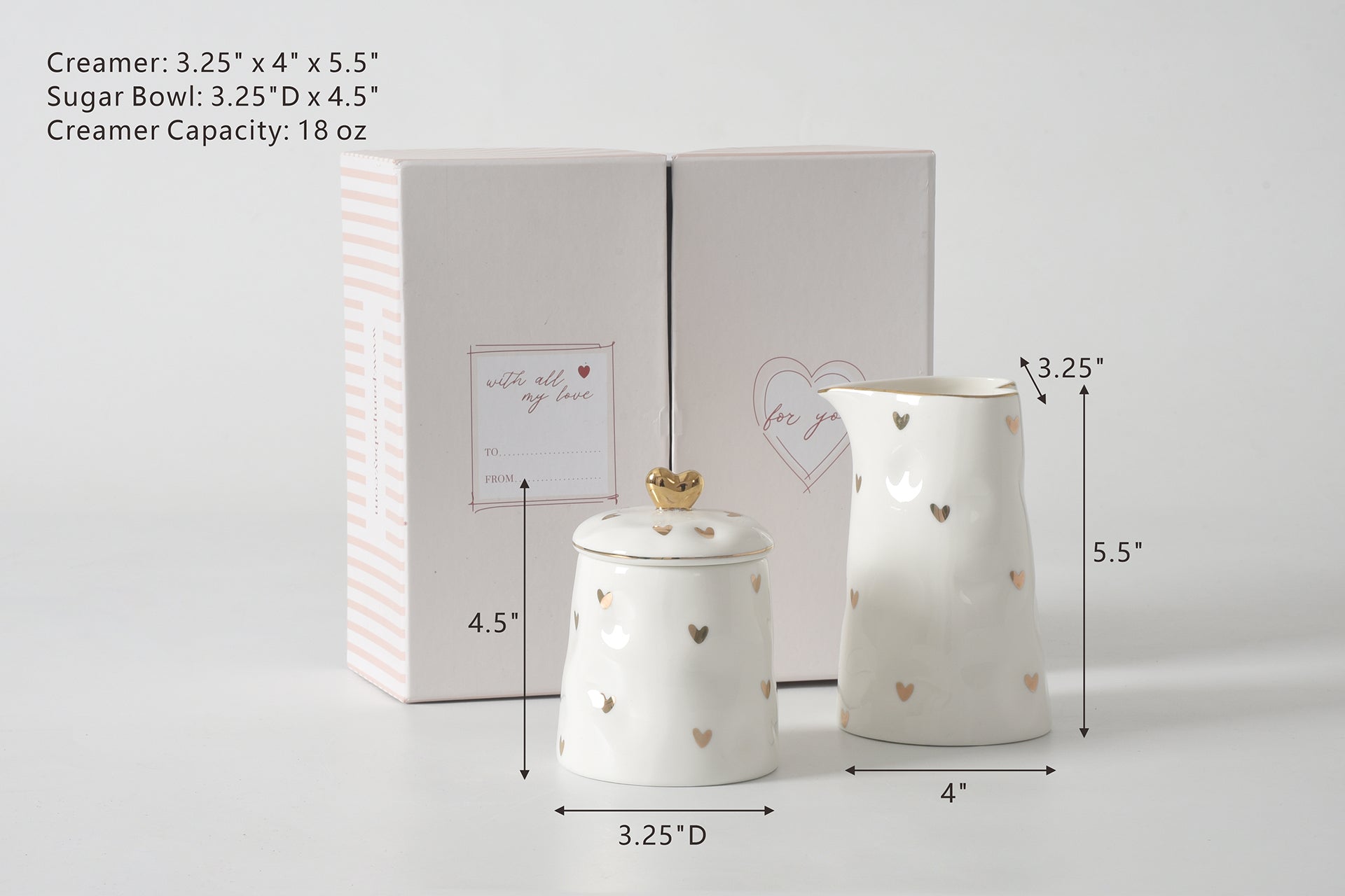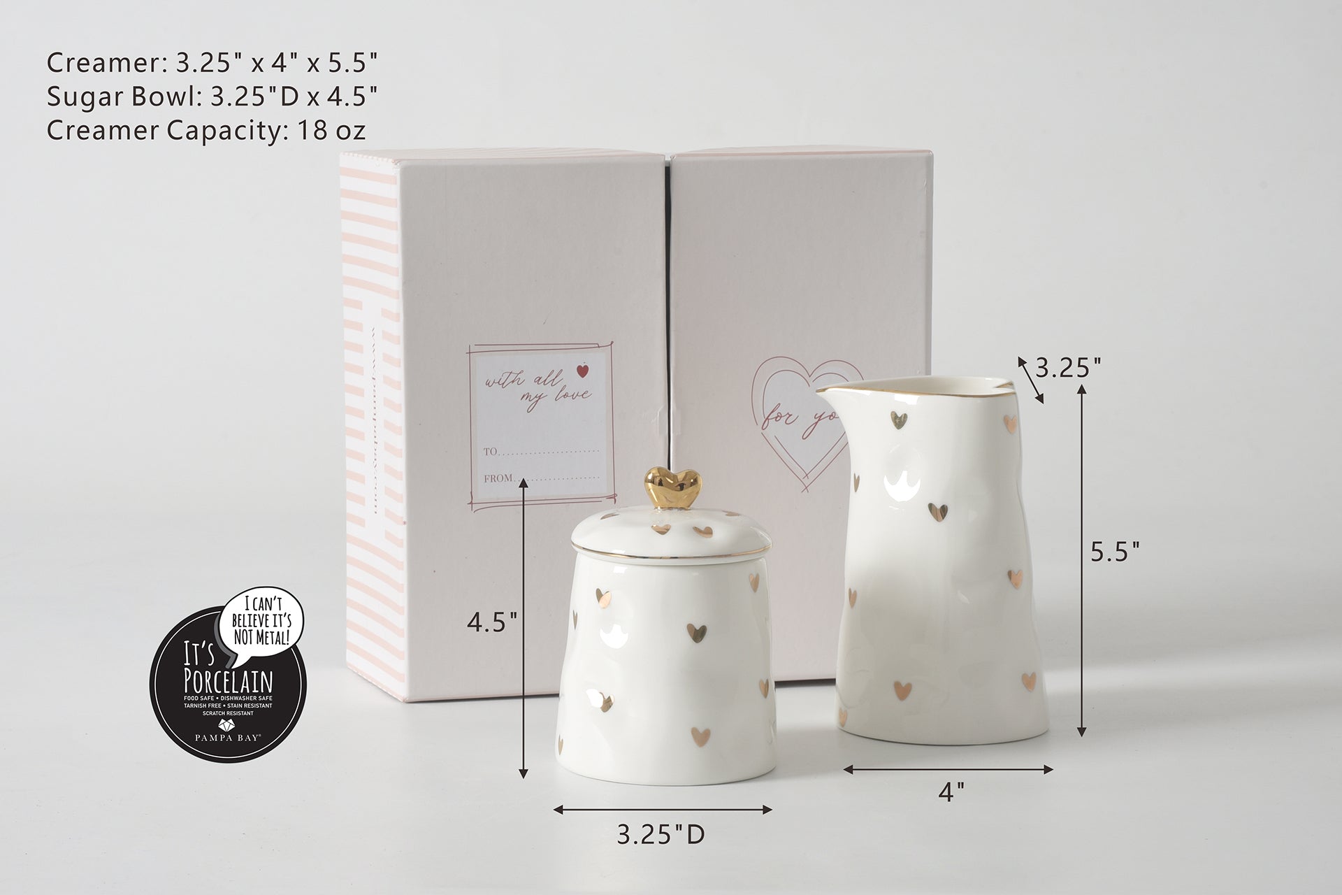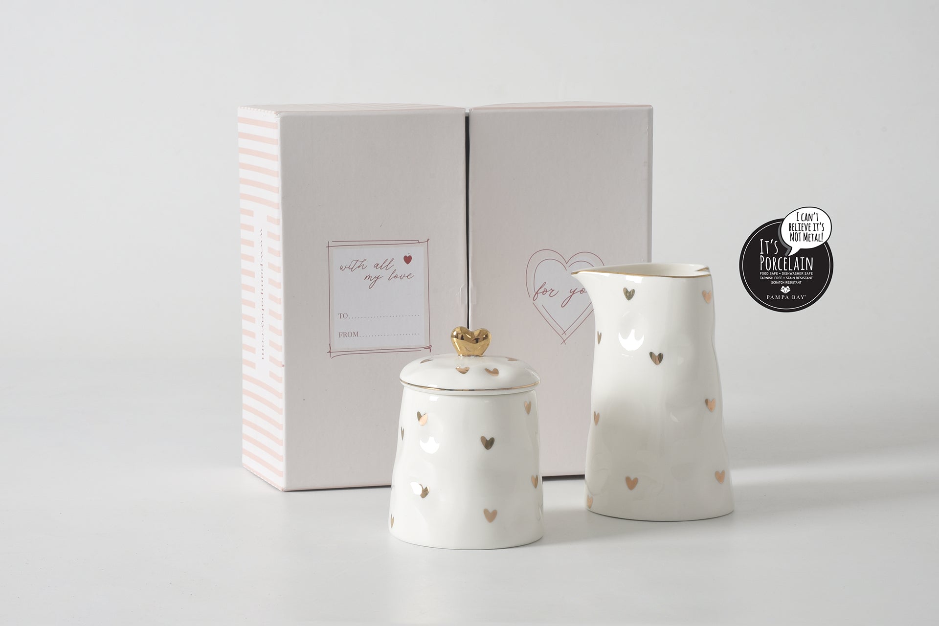 Sugar Bowl & Creamer Set from our Heart to Heart Collection. Make your tea or coffee just the way you like with this charming creamer and sugar set. Beautifully packed in a gift box, with a fun sentiment on the cover that can be personalized. The perfect housewarming or hostess gift! Crafted in a stunning white porcelain with delicate gold-tone decorations. Food safe, dishwasher safe, oven safe to 500 degrees F.